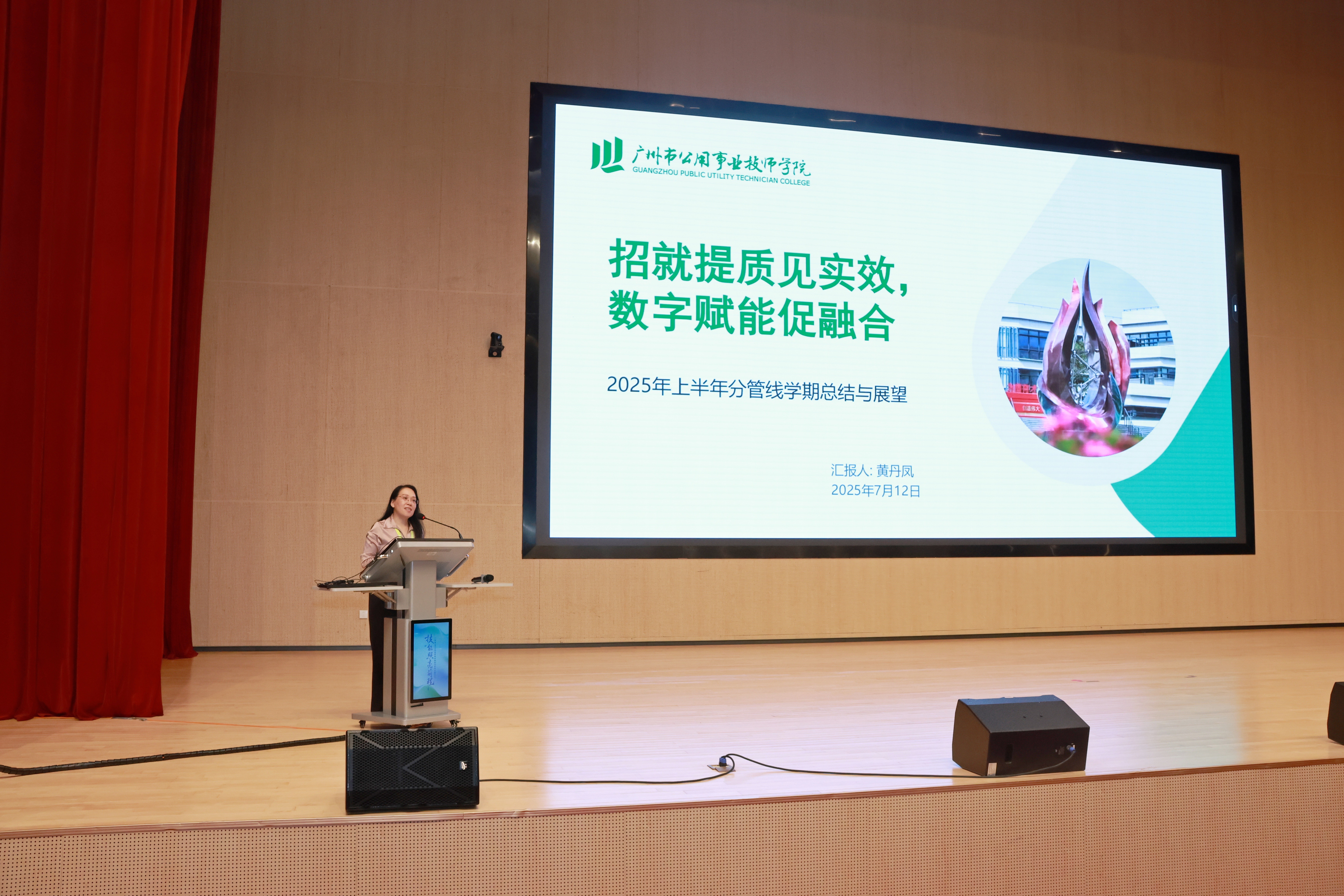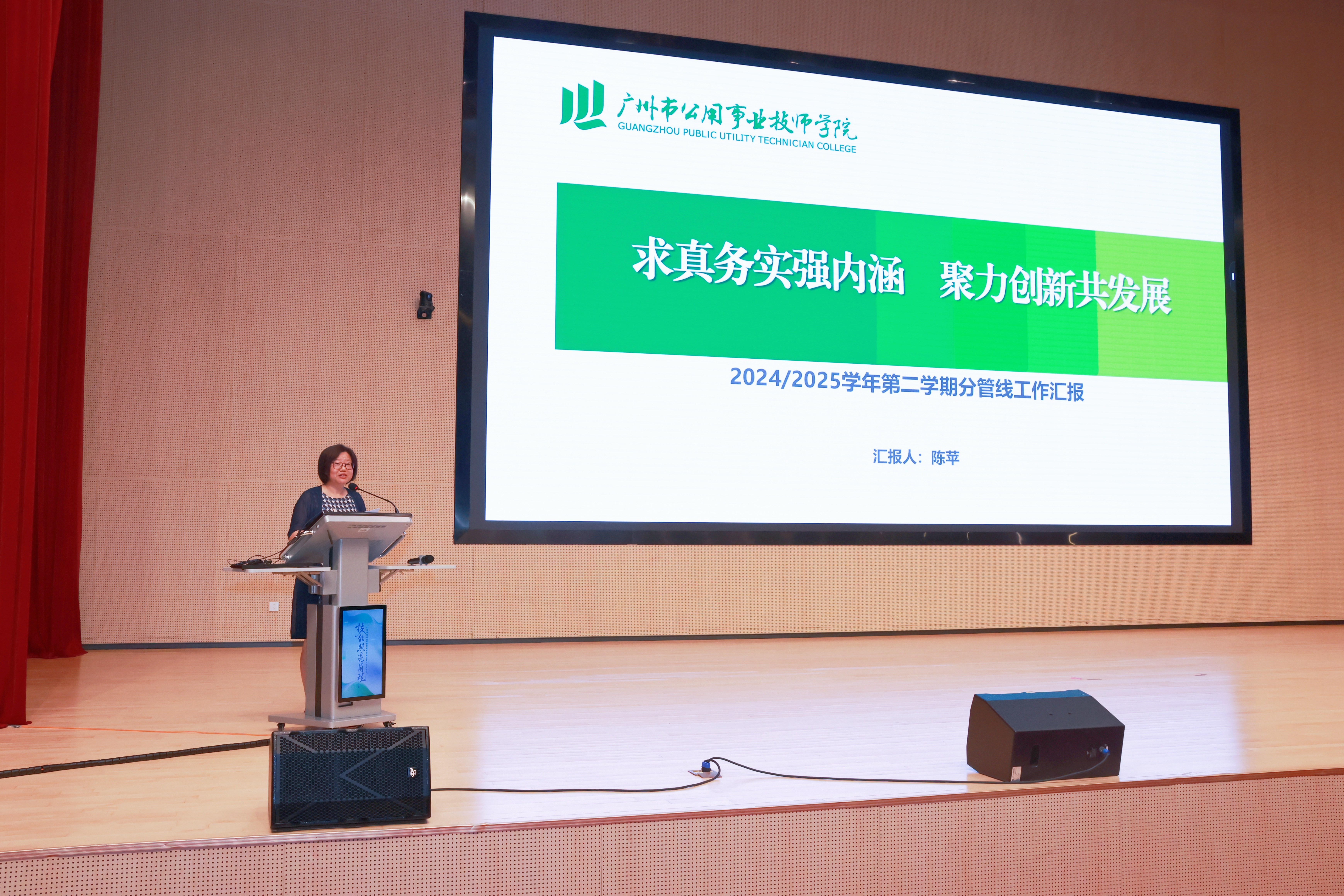 陈苹专职党委副书记以“求真务实强内涵,聚力创新共发展”为题进行学期分管工作总结。她表示,本学期通过多方联动维保增效、建章立制流程细化、健全体系闭环防控等举措,打造后勤“五心”服务,提升环境育人实效;通过强化师风师德教育、夯实四大工程提升高水平师资队伍能力,增强核心竞争力;通过扎实推进德育队伍专业化成长、融合资源着力六项育人重点,聚焦优良学风展现活力校园,构建三全三化校园安全管理体系,为学院“内涵发展”主题建设助力赋能。