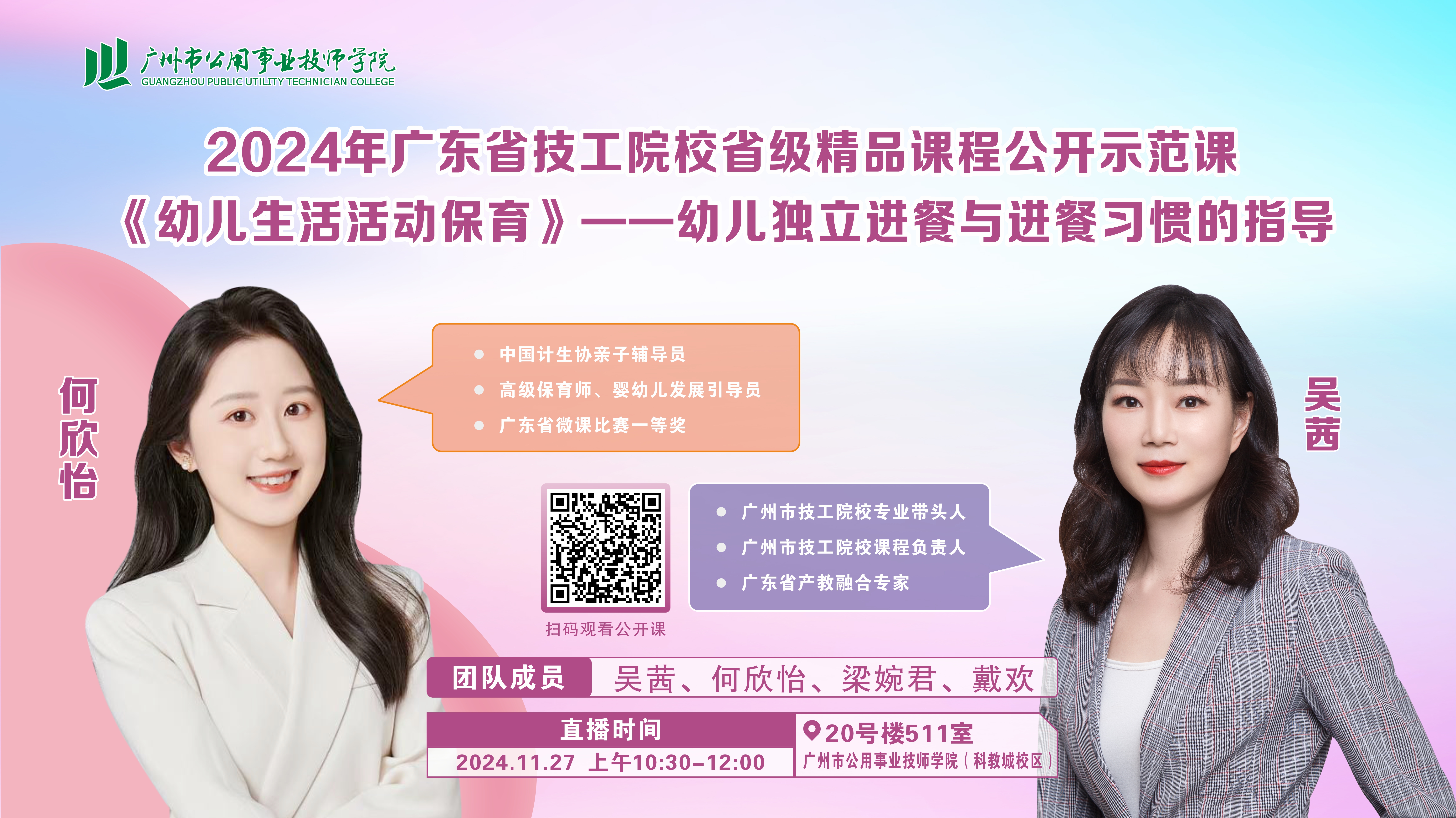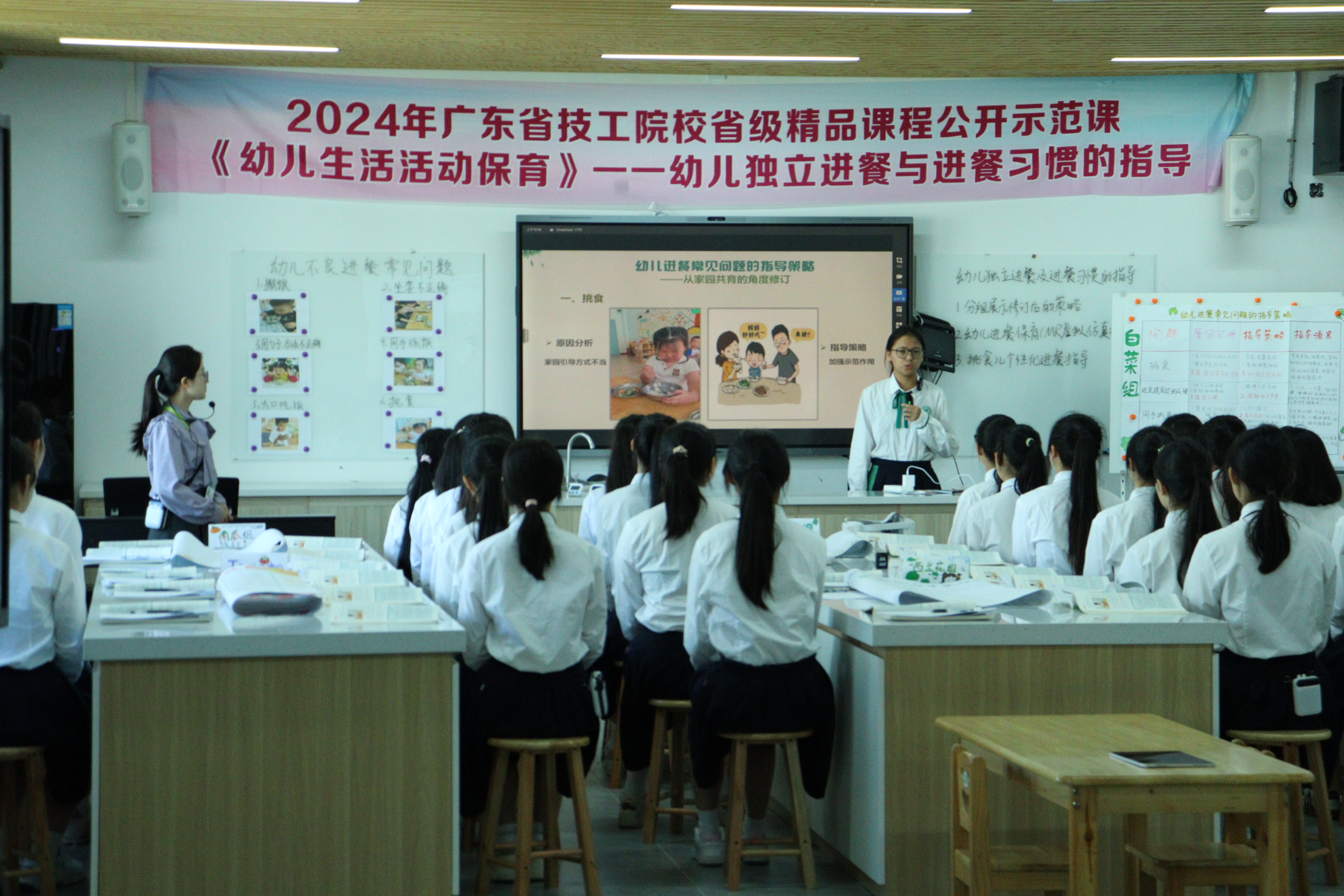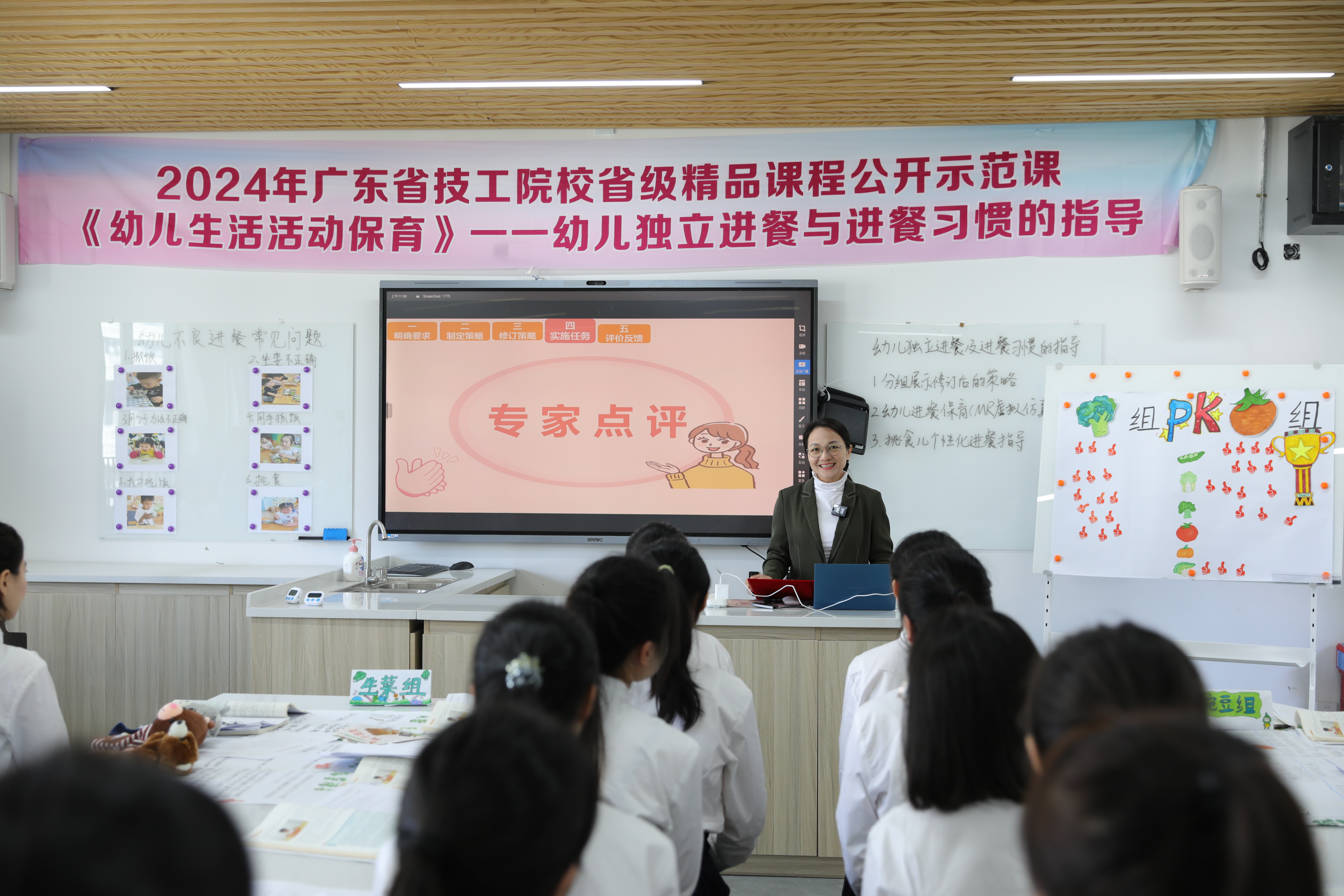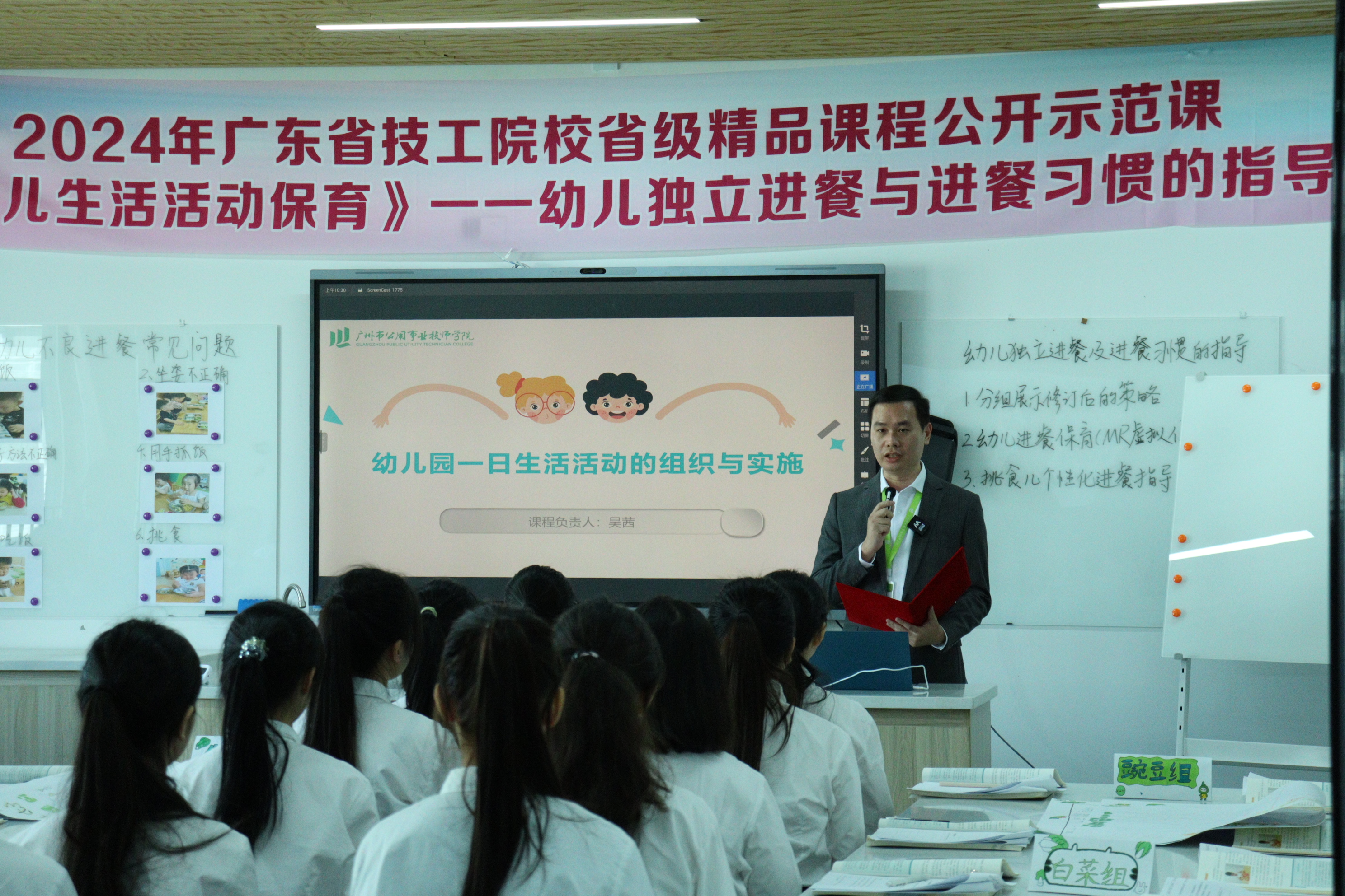 2024年11月27日,2024年广东省技工院校省级精品课程公开示范课《幼儿生活活动保育》在广州市公用事业技师学院科教城校区顺利举办。来自全省20余名领导和教师参与线下观课,并同步线上直播,广东省婴幼儿照护与早期发展行业协会常务副秘书长冯荔雯莅临指导。本次省级精品课程公开示范课活动包括说课程、课堂实施和评课三个环节,说课教师为课程负责人吴茜老师,授课教师为何欣怡老师。
