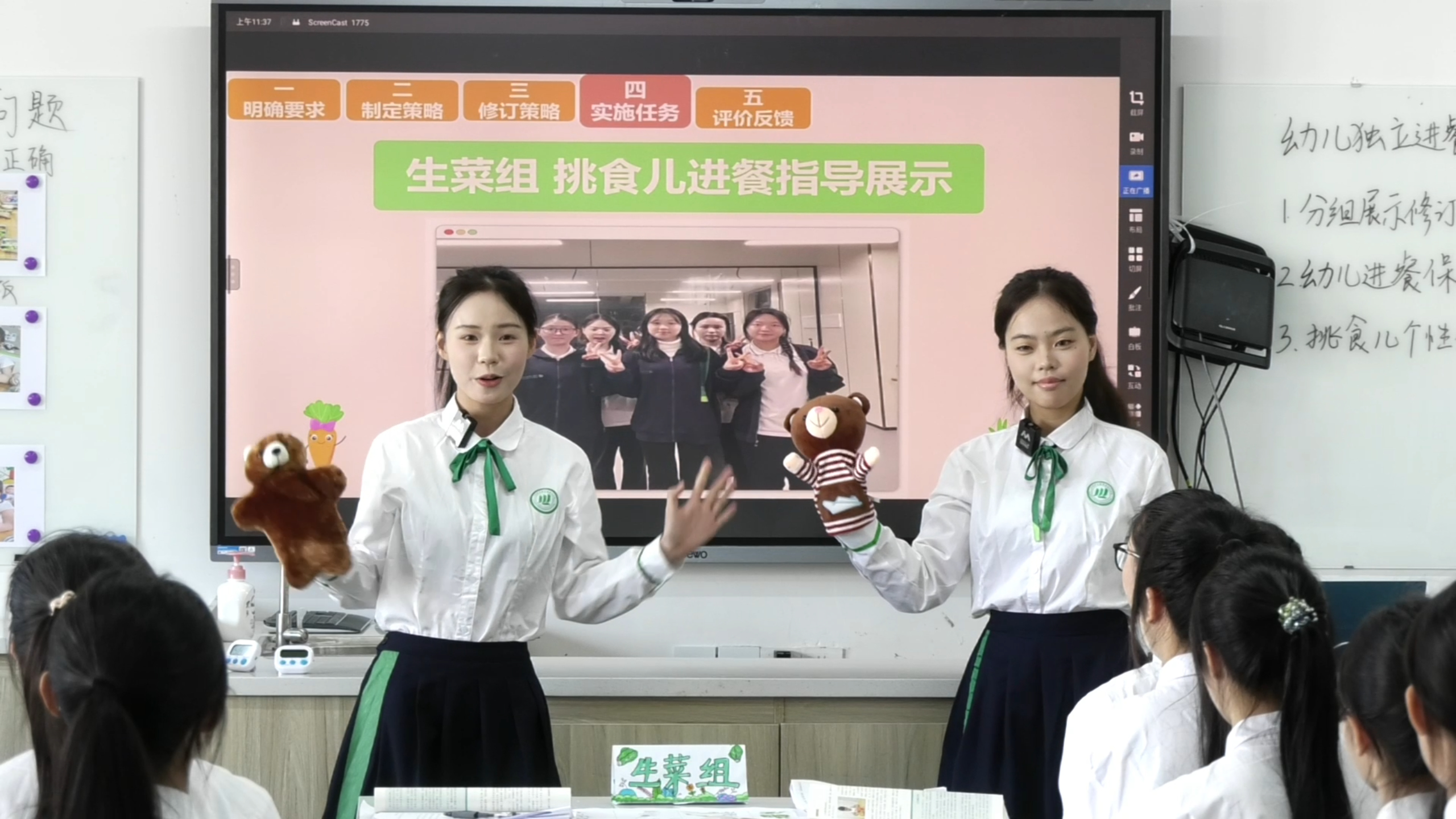课堂实施围绕“指导幼儿独立进餐的实施”这一学习任务,在“幼儿常见进餐问题及其解决策略”的学习内容中,教师精心设计了三个学习活动:幼儿进餐常见问题的指导策略修订成果展示、MR虚拟仿真组织幼儿进餐保育、挑食儿个性化进餐指导,按照计划持续有效推进以学生为主体的活力课堂。