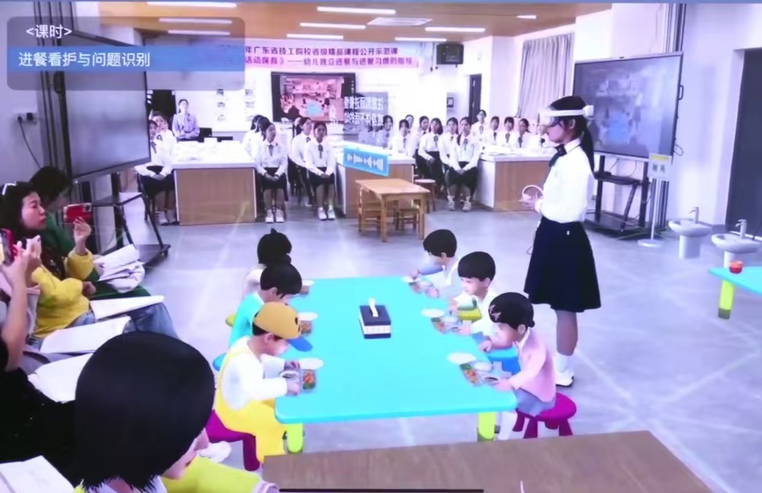历经6年的精心打磨,《幼儿生活活动保育》课程形成了鲜明的特色亮点。其中,“5G+MR全息智慧课堂”无疑是最大的创新之处。这一技术打破了传统情境模拟的限制,让学生在校内就能身临其境地感受到幼儿园的工作环境,从而更加深入地理解和掌握保育知识。此外,课程还依托地方文化资源,将民族文化、校园文化、职业文化“三元”融合,增强了教学的特定性和育人的实效性,提升了本土化特色。