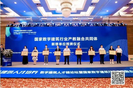 城建系杨蕾主任代表学院领取国家数字建筑⾏业产教融合共同体新成员的牌匾。