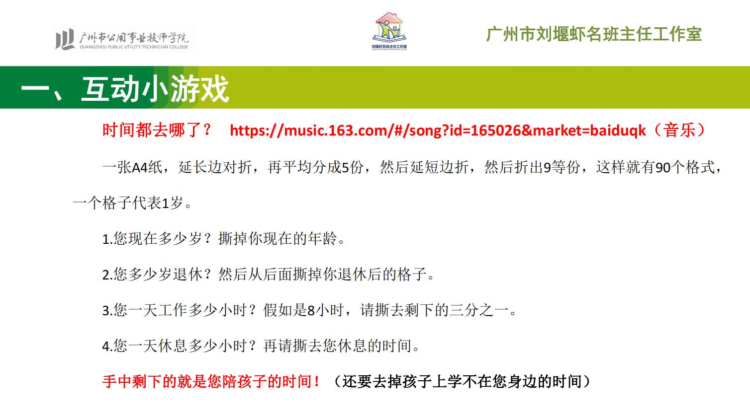 刘堰虾老师组织了一场名为“时间都去哪了”的互动游戏。通过游戏,家长们深刻体会到与孩子共度时光的珍贵,也意识到与孩子深化亲密关系的重要性。