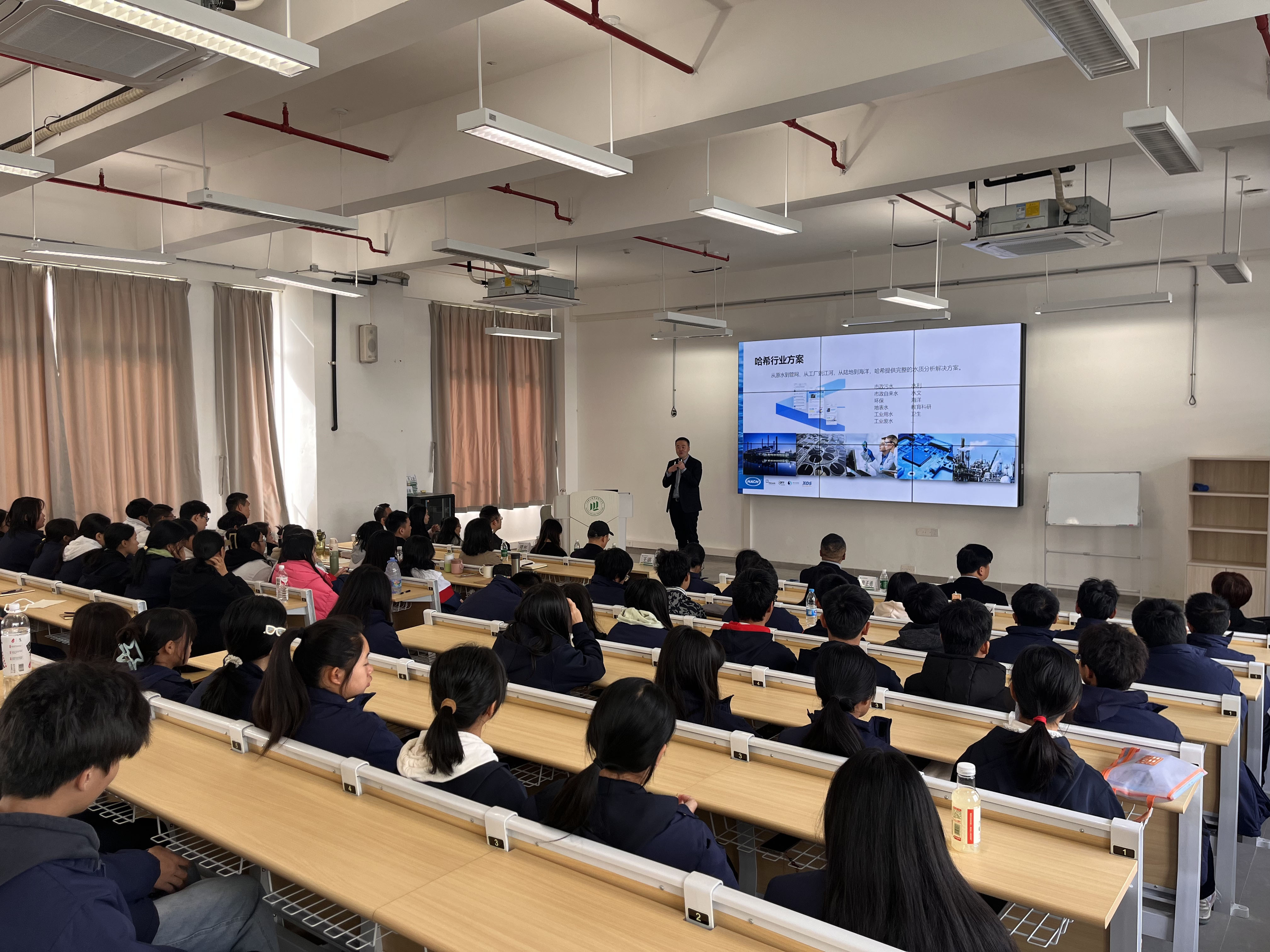 随后,王湛博士和哈希水质分析仪器(上海)有限公司的吴锐副总裁为学生上了一堂生动的水处理技术和企业人才需求讲座。