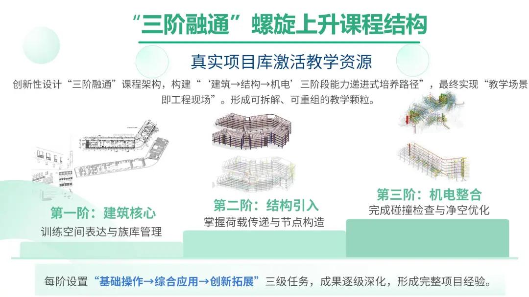 项目亮点:本项目以“三阶融通·双轨驱动”为核心模式,构建了“建筑→结构→机电”三阶段能力递进式课程体系,有效破解了传统教学中专业孤立、协同不足的难题。