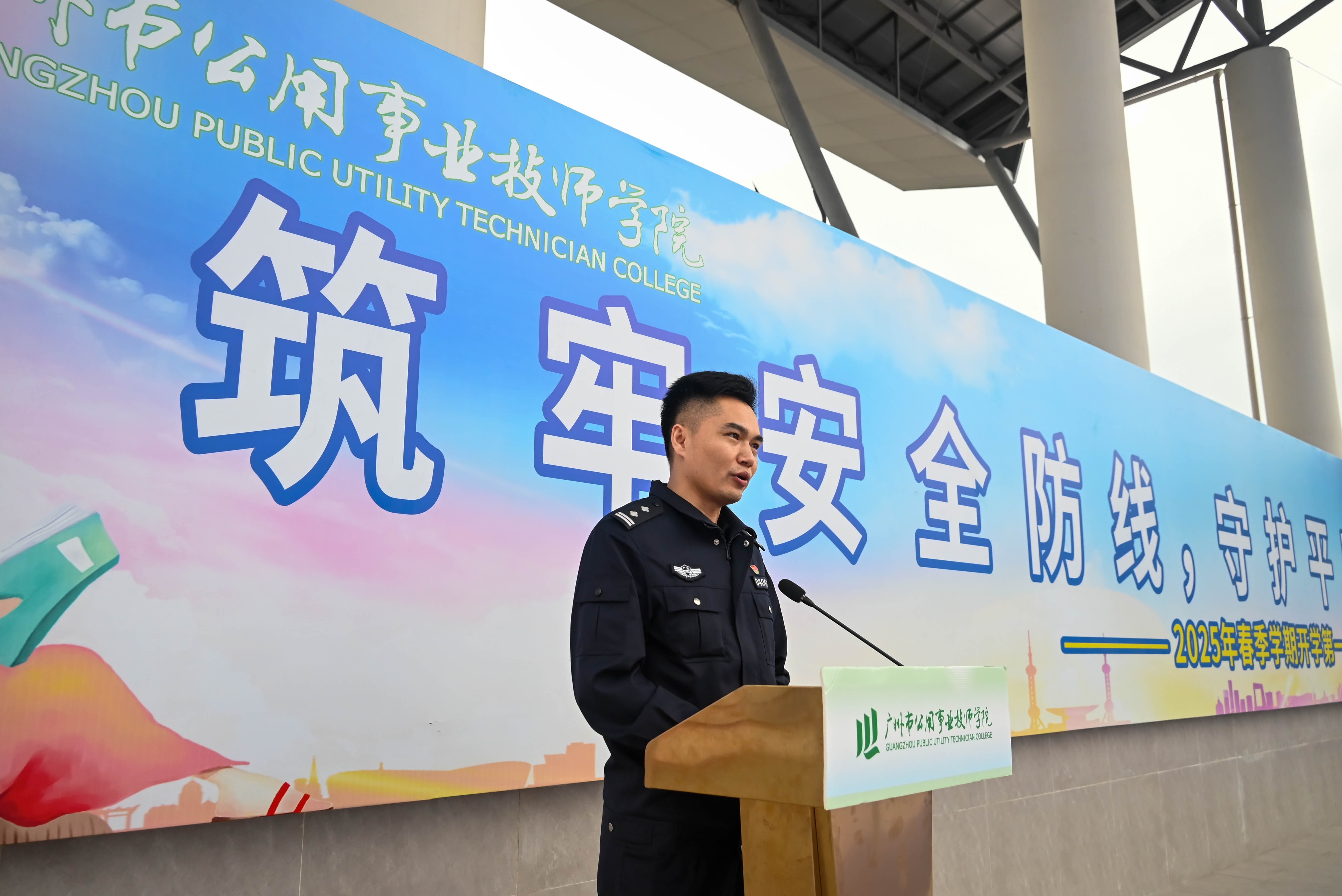 学院法治副校长、广州市公安局增城分局朱村街派出所黄所长为学院师生讲授校园安全教育第一课。他从近期警情通报讲起,讲解未成年人违法犯罪的法律规定和违法后果,围绕电信网络诈骗典型案例、交通安全、AI干警等方面开展法治教育和主题宣传,教育师生学法守法懂法用法,从自身做起,增强安全防范意识,共同维护校园安全稳定。