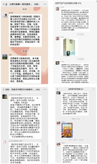 行政第一党支部、行政第四党支部、信息文创产业系党支部、社会服务产业系党支部在交流群推荐阅读书目并分享心得