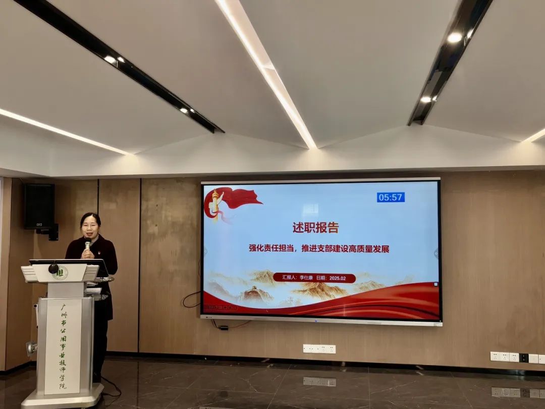 她指出,今年是学院实施“十四五”规划的收官之年,也是建设广东省高水平技师学院的关键之年。学院各党支部要突出学习习近平新时代中国特色社会主义思想,全面贯彻党的二十大精神和二十届二中、三中全会精神,习近平总书记视察广东、广州系列重要讲话重要指示精神以及关于党的建设的重要思想,要增强基层党组织政治功能和组织功能,提升党的组织体系建设整体效能。突出落实基层党建责任制,树立大抓基层的鲜明导向,推动党支部履行抓基层党建工作主体责任、党支部书记履行第一责任人职责。她强调,这次述职评议会起到承上启下作用,各党支部要做好党支部优化设置调整和选举后的工作交接;系统谋划新校区搬迁后与属地街道、企业和兄弟院校等单位的共建事宜;深入思考“一支部一品牌”建设的具体措施,促进党建与业务深度融合,持续推动基层党建工作提质增效,以高质量党建引领学院各项事业高质量发展。