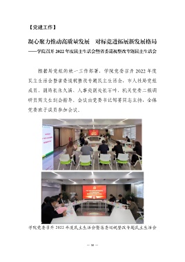 【党建工作】 凝心聚力推动高质量发展 对标竞进拓展新发展格局 ——学院召开 2022 年度民主生活会暨省委巡视整改专题民主生活会 根据局党组的统一工作部署,学院党委召开 2022 年度 民主生活会暨省委巡视整改专题民主生活会,市人社局党组 成员、副局长朱久满、人事处副处长石叶、机关党委二级调 研员周文生到会指导。会议由党委书记邹菁同志主持,全体 党委班子成员参加会议。 学院党委召开 2022 年度民主生活会暨省委巡视整改专题民主生活会 — 10 —