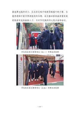 蓄逐梦远航的动力,在攻坚克难中砥砺勇毅前行的力量,在 锐意进取中提升劈波斩浪的本领,成为推动国家高质量发展 的高素质技术技能人才,为中华民族的伟大复兴接续奋斗。 学院党委书记邹菁同志(左一)为师生讲党课 学院党委书记邹菁同志(左五)为师生讲党课 — 26 —