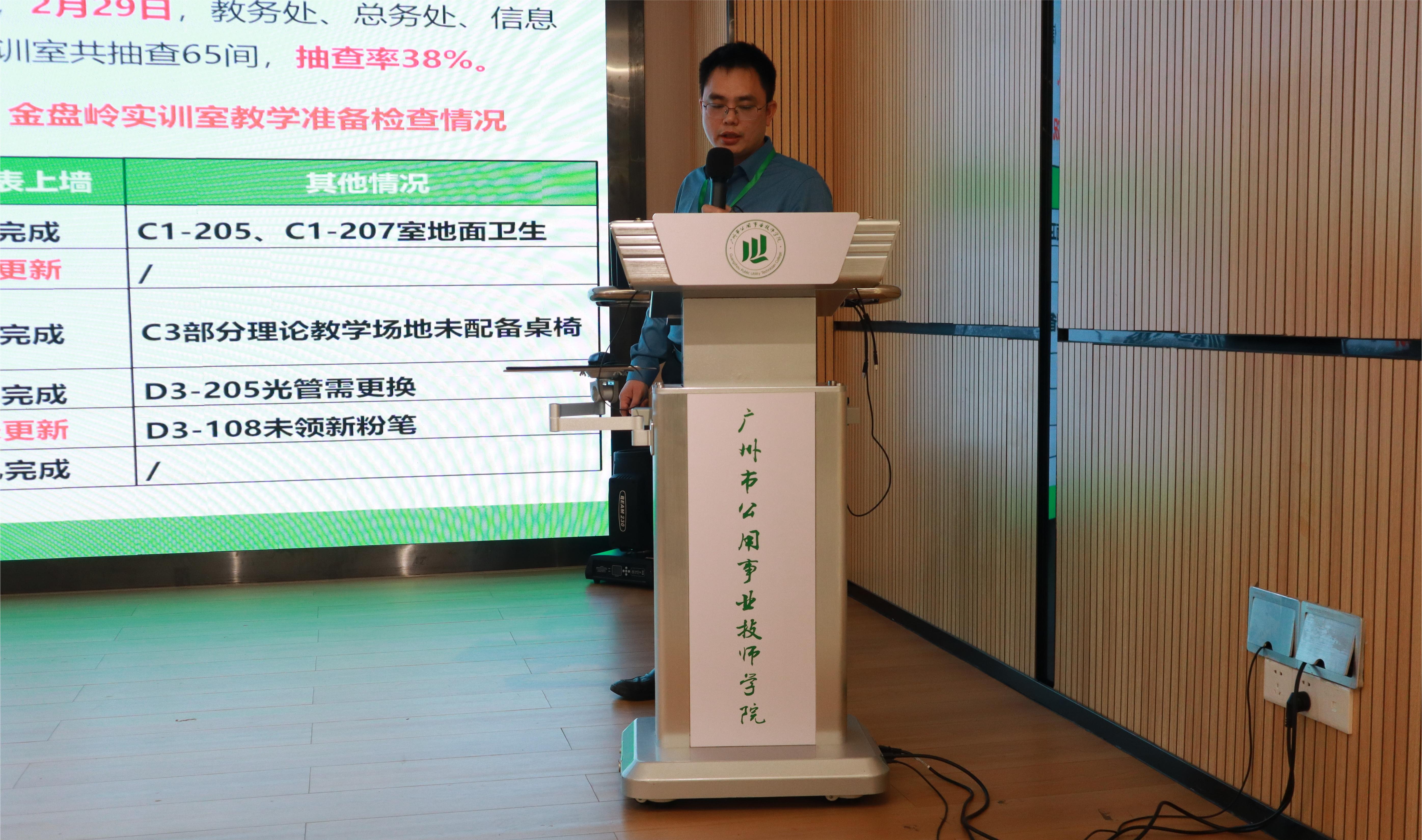 教务处副主任李伟鹏通报新学期期初教学检查、教学设施设备运行情况以及开学第一课、开学第一周教学情况。