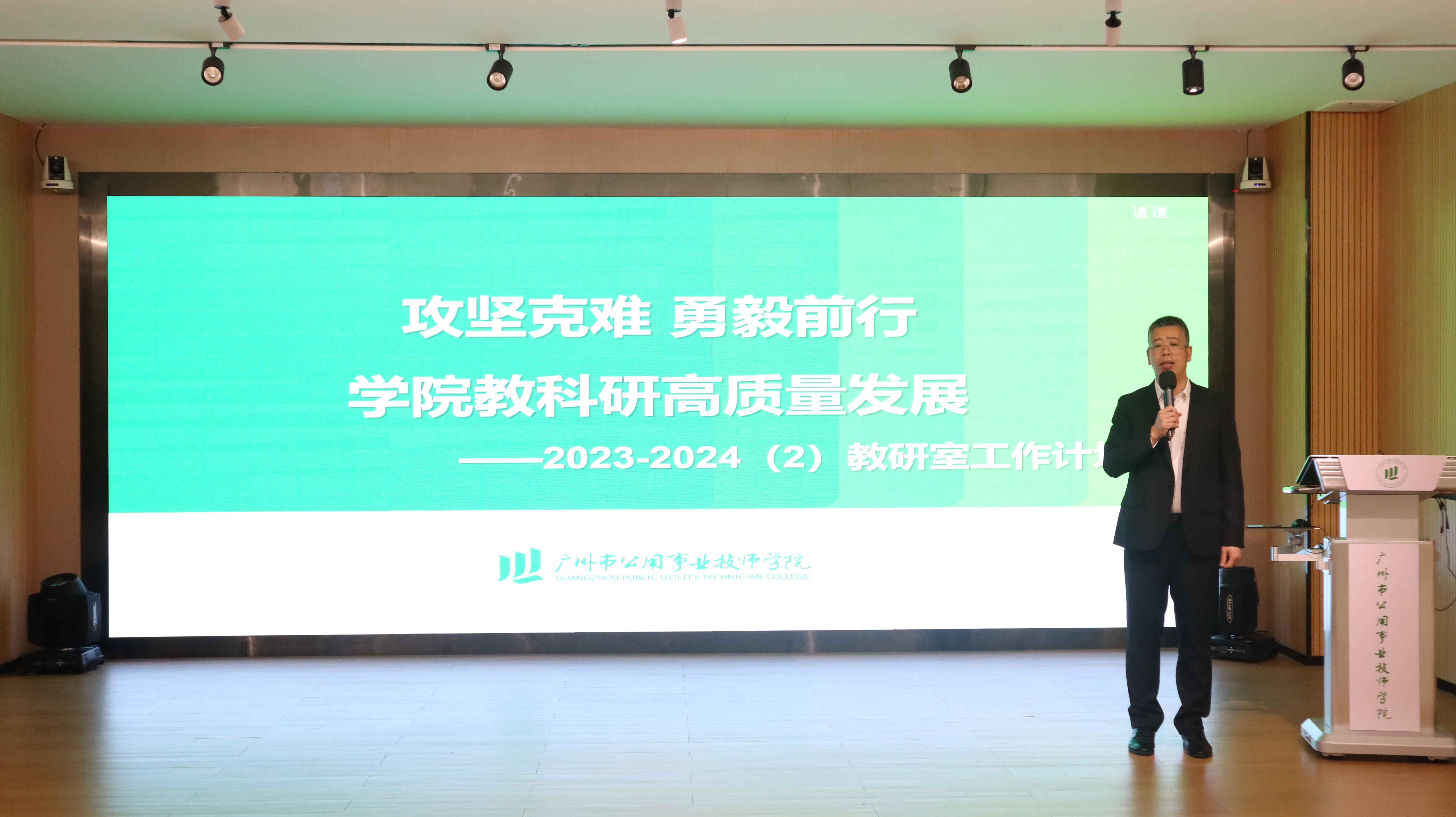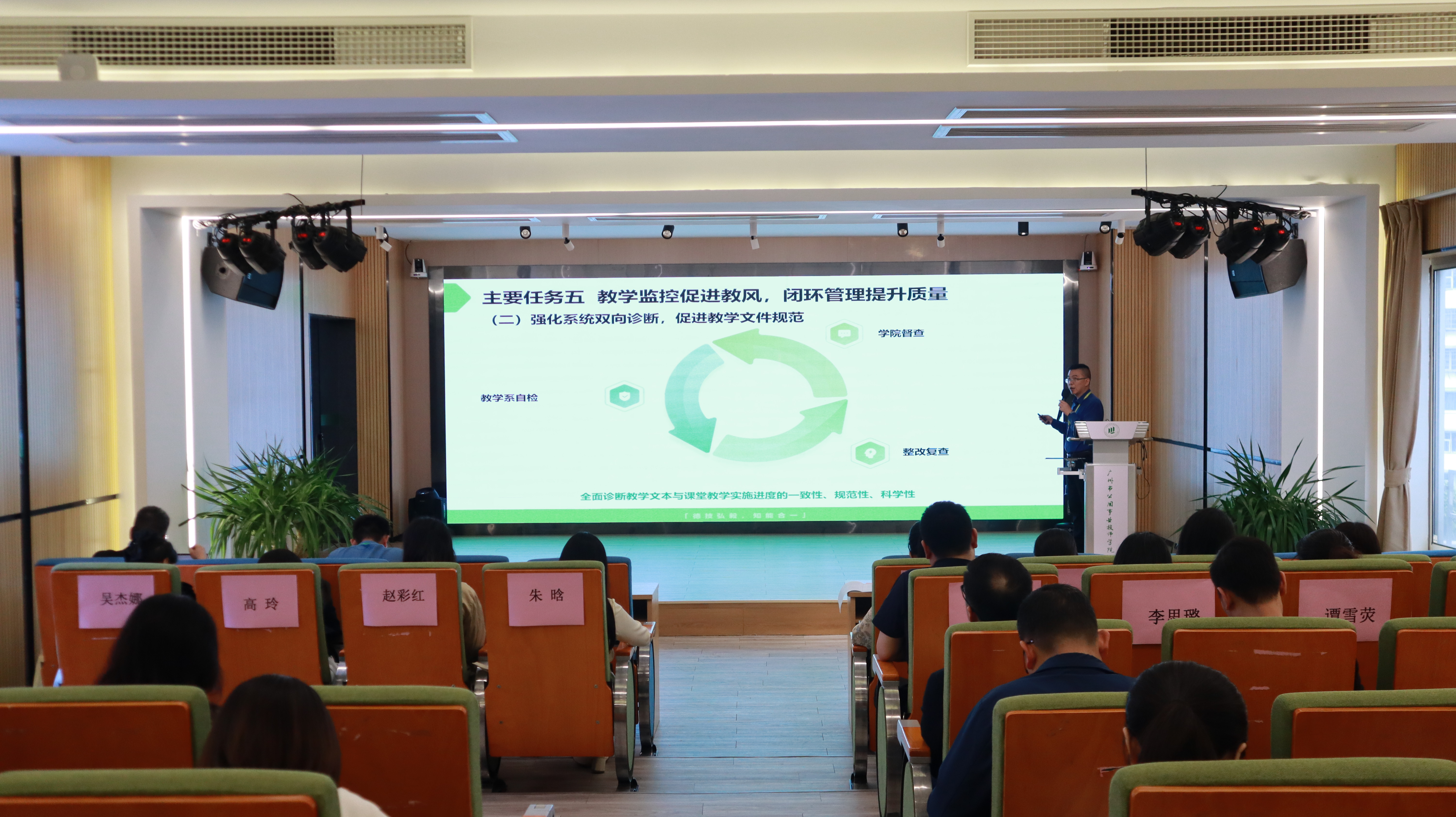 教务处主任李仕康聚焦“教风学风校风建设年”作新学期教学管理工作计划报告。他指出,教务处将围绕优化资源配置、落实制度执行、榜样示范引领,优质课堂展示、质量监控反馈等教学管理工作思路,坚持教风引领学风、学风促进教风,持续推进教风学风协同建设,着力提升教学质量。