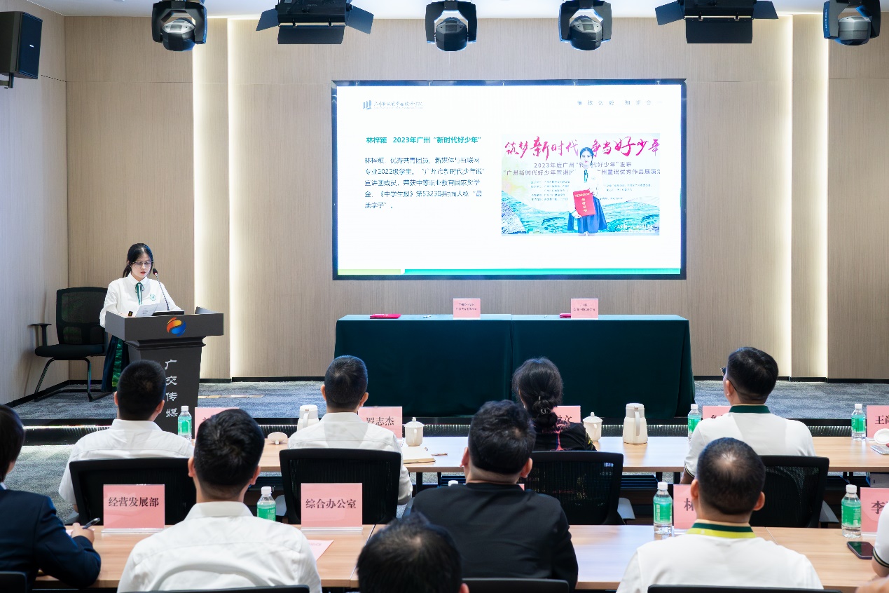 荣获2023广州“新时代好少年”称号的林梓颖作为学生代表进行发言。她表示,城市公交车身广告设计大赛提供了实战平台,她一定会珍惜机会,尽情挥洒创意,设计出独具匠心的作品,努力向专业新媒体人进军,怀揣技能成才、技能报国的理想,成就精彩人生。