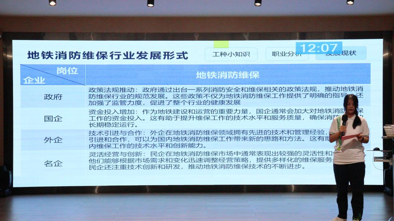 总决赛包含作品展示和答辩两个环节,各组代表成员通过PPT作品,向评委和观众展示岗位调研分析相关内容,导师们围绕职业能力提升、职业机会获得及职业生涯发展等话题进行提问。