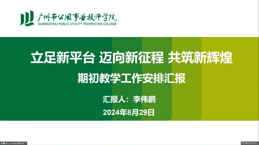 教务处副主任李伟鹏以 “立足新平台,迈向新征程,共筑新辉煌”为主题,汇报了新学期期初教学工作安排。他通过详实的数据,细致讲解了新学期的教学进度、期初教学检查以及教学任务安排。此外,他深入解读了秋季开学方案,并在课程表查询反馈、开学第一课、上课时间安排、线上教学平台的选择与使用、线上线下课堂教学规范与管控等方面给予了教学工作提醒。