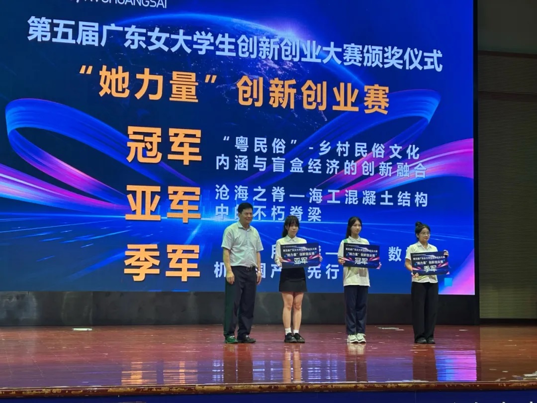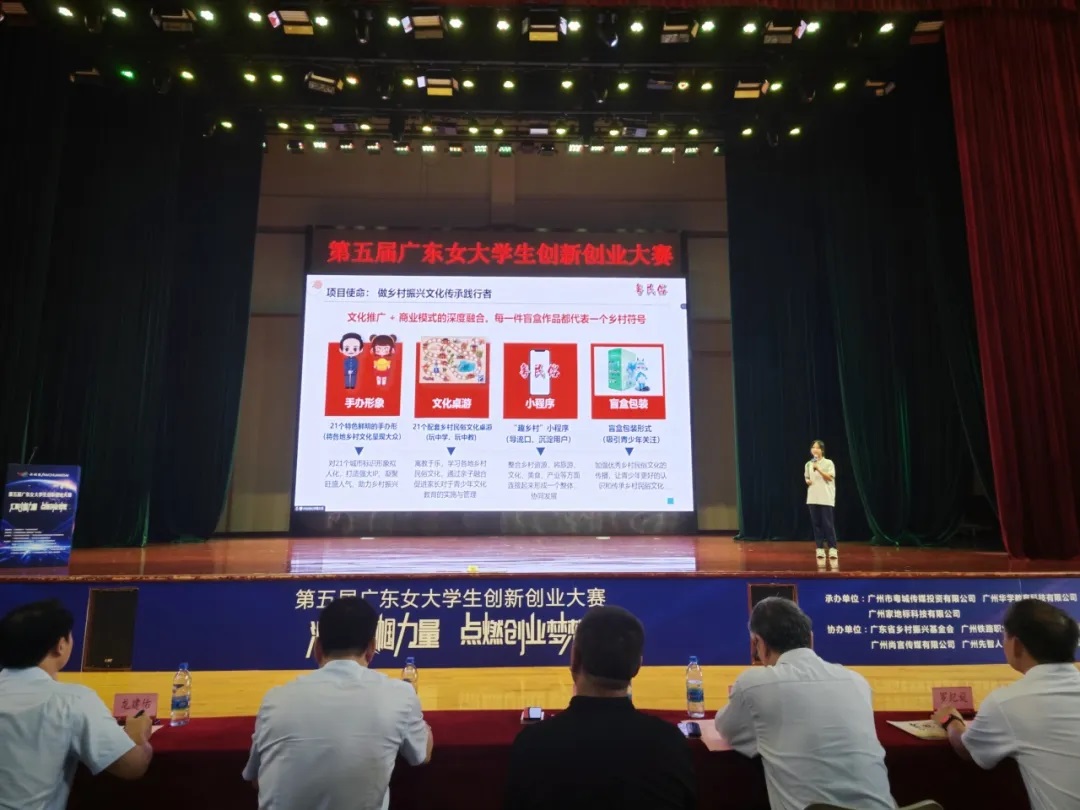 8月30日,第五届广东女大学生创新创业大赛决赛在广东女子职业技术学院(番禺校区)圆满落幕。在决赛及冠军争夺赛中,由学院钟锡玲、卢少兰教师团队指导,李匀、朱金诚、林泽恩3位同学组队参与的“粤民俗--乡村民俗文化内涵与盲盒经济的创新融合”作为唯一来自技工院校的项目,与来自暨南大学、广东工业大学等本科及高职院校的45个精英团队同台竞技,斩获创意组金奖,一举夺得“她力量”创新创业赛总冠军,成为全场瞩目的焦点。
