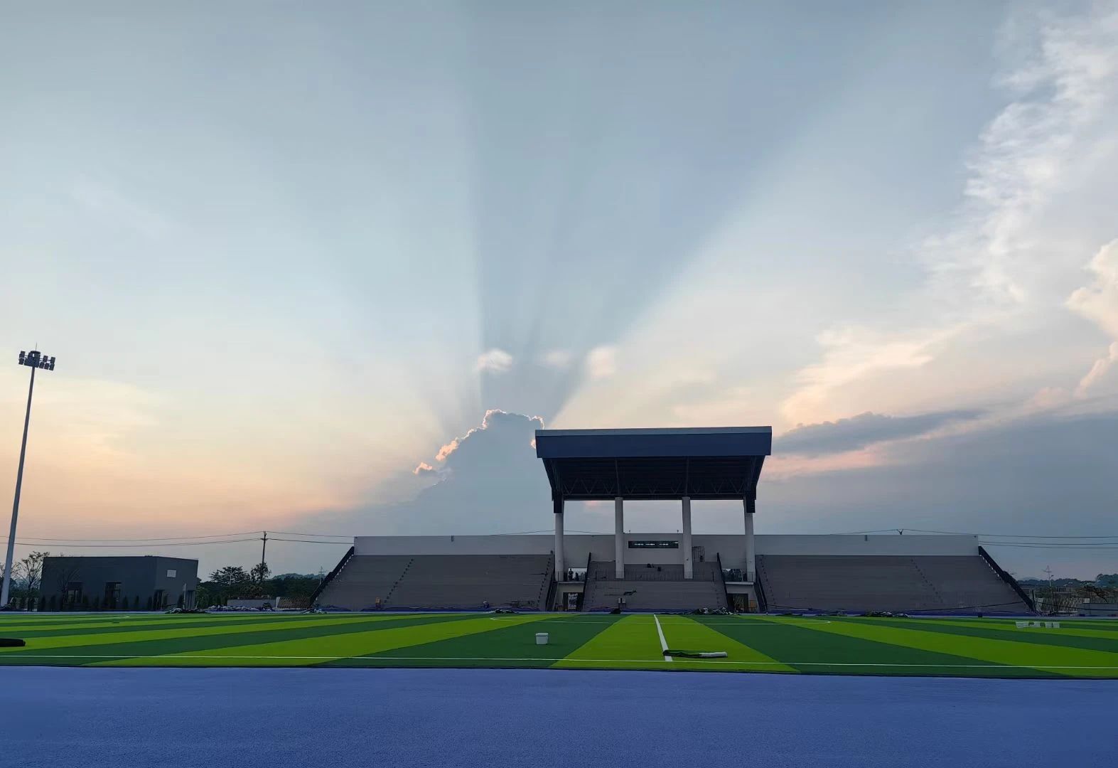 薰衣草色的400米跑道在蓝天下格外美丽