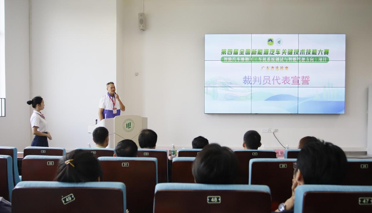 广东省机械行业协会副秘书长黄建华致辞。他希望通过技能竞赛进一步推动车机系统调试与智能驾驶技术的研发和应用,发现和培养更多适应新技术发展的高素质技能人才,赋能行业高质量发展。