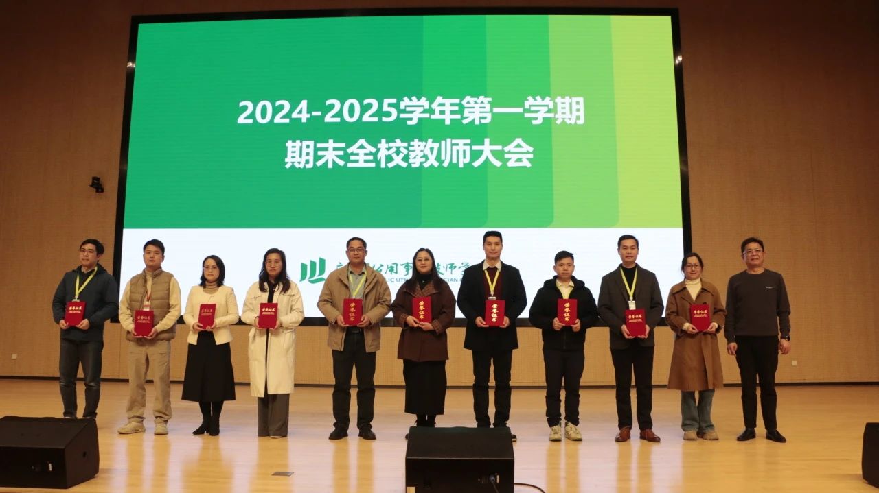 学院领导为2024年下半年各重大教学教研成果教师代表颁奖,包括2024年广东省技工院校精品课程、广州市技工院校专业带头人、广州市技工院校重点特色专业、广州市技工院校课题与学院教科研课题结项。
