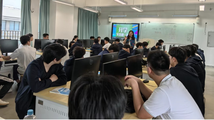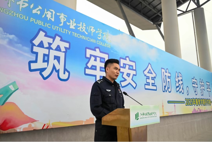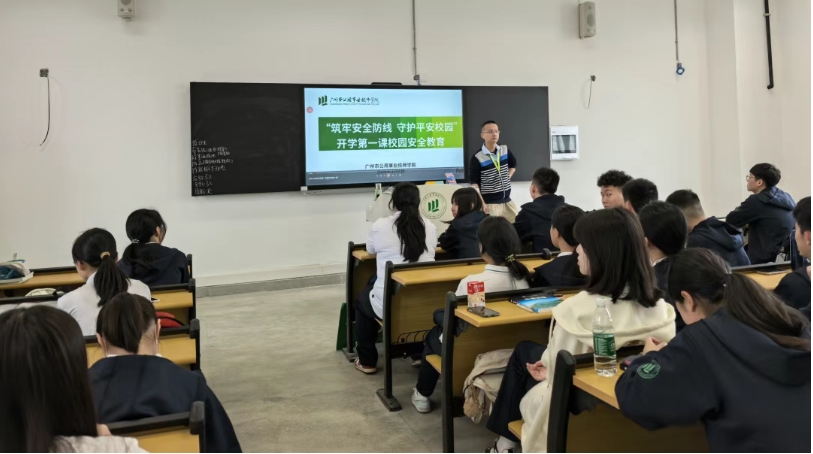 学院法治副校长、广州市公安局增城分局朱村街派出所黄所长为学院师生讲授校园安全教育第一课。他从近期警情通报讲起,讲解未成年人违法犯罪的法律规定和违法后果,围绕电信网络诈骗典型案例、交通安全、AI干警等方面开展法治教育和主题宣传,教育师生学法守法懂法用法,从自身做起,增强安全防范意识,共同维护校园安全稳定。