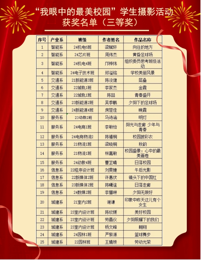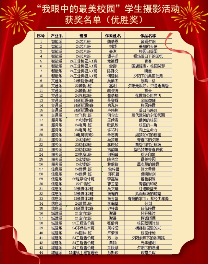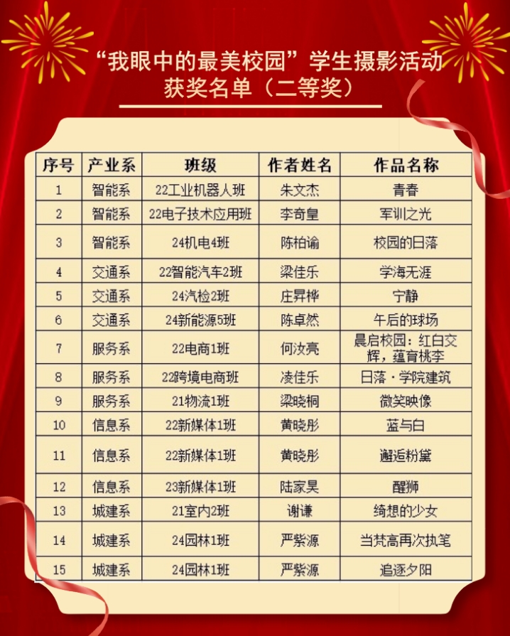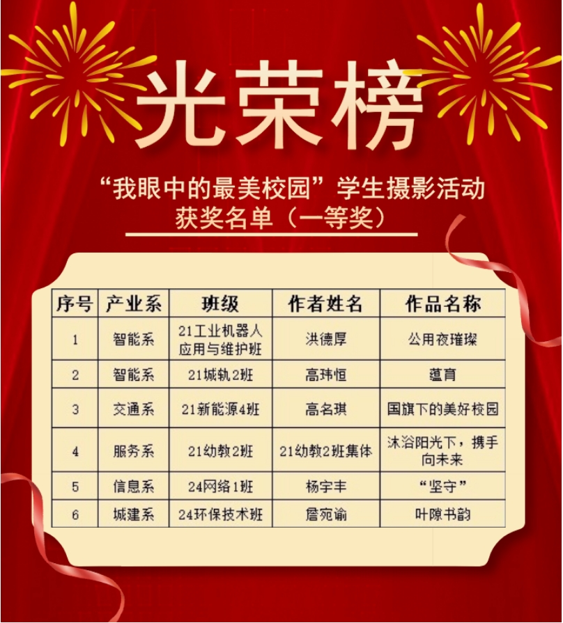 以镜头捕捉美好,用影像传达情感。由学生工作处主办、智能控制产业系承办的“我眼中的最美校园”学生摄影活动获奖名单新鲜出炉,经评选,共有一等奖6名、二等奖15名、三等奖25名、最佳人气奖44名。