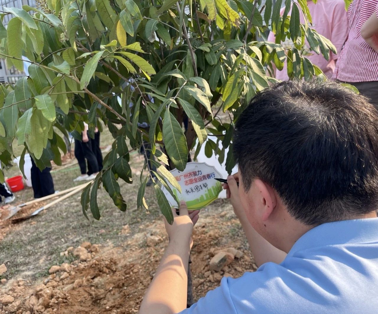 人社系统青年代表、师生志愿者等百余人共同执锹培绿,以“志愿红”守护“生态绿”,为迎接第十五届全运会打造“推窗见绿、四季飞花”的城市环境注入青春动能。青年志愿者们分组协作,挥锹培土、扶苗浇水,栽下树苗。志愿者们纷纷在“植树印记牌”上书写生态承诺,许下“与树共成长”的美好愿景。