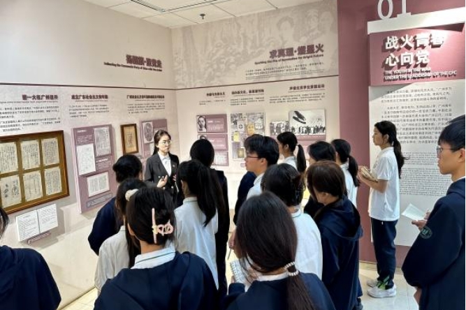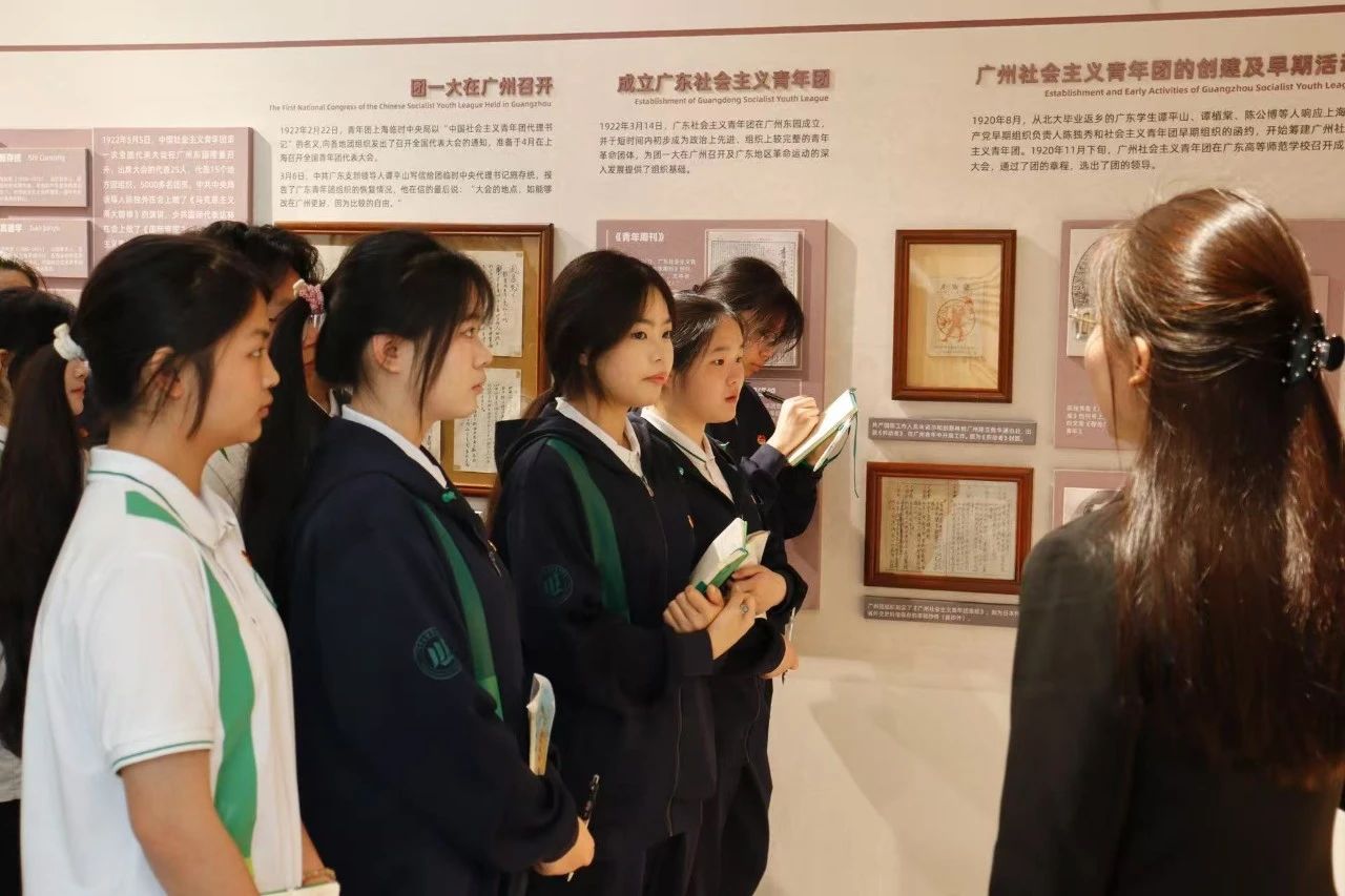 在广州市团校老师的带领和讲解下,师生代表参观了“青春心向党——中国共产党领导下的广州青年运动发展历程展”。该展览分为“战火青春心向党”、“同心建设新中国”、“改革开放立潮头”、“逐梦建设新时代”四个篇章,通过图文展板、实物陈列、多媒体影像等多元形式,系统回顾从1919年起至今跨越百年的广州青年运动史,讲述广州青年在革命、建设、改革、新时代等各时期的作为与风采以及广州各级团组织的不懈追求。