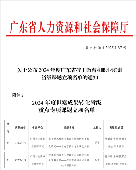 近日,2025年新一批广东省技工教育和职业培训省级课题立项名单公布,学院申报的四项课题全部获批立项,实现立项质量与数量双突破。此次立项的课题聚焦世赛成果转化、专业集群建设等领域,深度对接区域产业需求,凸显了学院以新质生产力为核心引擎,赋能粤港澳大湾区技能人才创新生态构建的积极作为。
