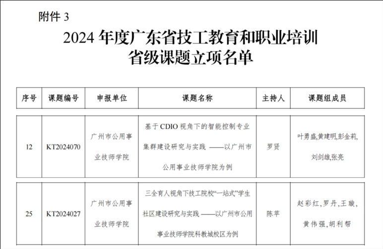 两项广东省技工教育和职业培训省级课题则分别以学院专业集群建设和育人模式创新为抓手,探索高技术技能人才培养新路径。