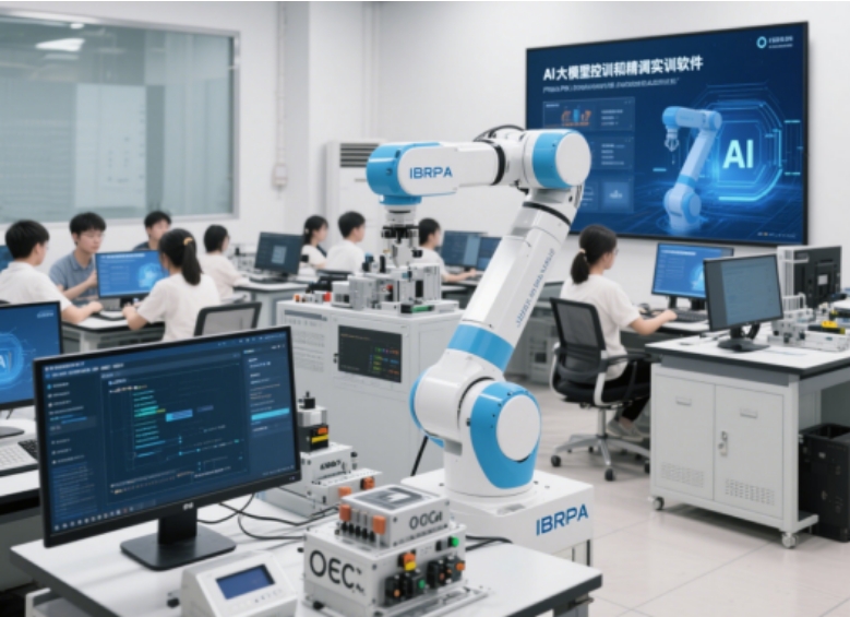 智能控制产业系则走在了技术融合的前列,正开展建设大模型与RPA(机器人流程自动化)融合应用实训室。该实训室在同类型中颇具亮点,首次运用了前沿的AI大模型训练与精调实训软件,搭配IBRPA机器人、OCR识别模块等一系列先进软硬件设备。