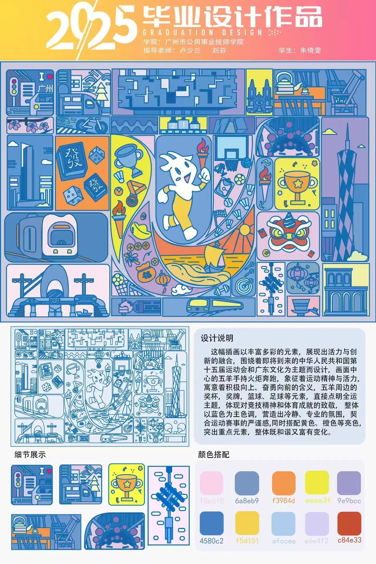 设计:朱倚雯导师:刘芬设计灵感:结合即将到来的“十五运”,围绕广东文化和运动元素设计系统插画,体现对竞技精神和体育成就的致敬。