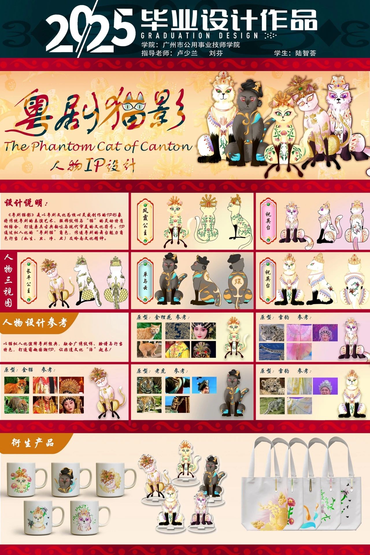 设计:陆智荟导师:刘芬设计灵感:以粤剧文化为核心灵感创作的IP形象设计,将传统粤剧重要角色形象化,角色的服饰纹样与“猫”的灵动特质相结合,打造兼具古典韵味与现代审美的文化符号。