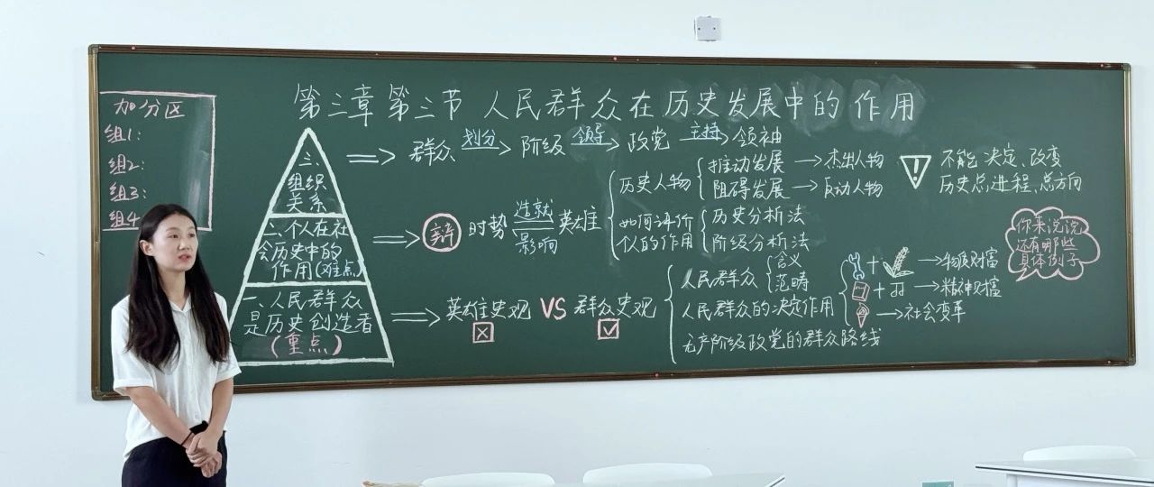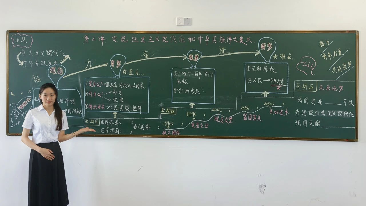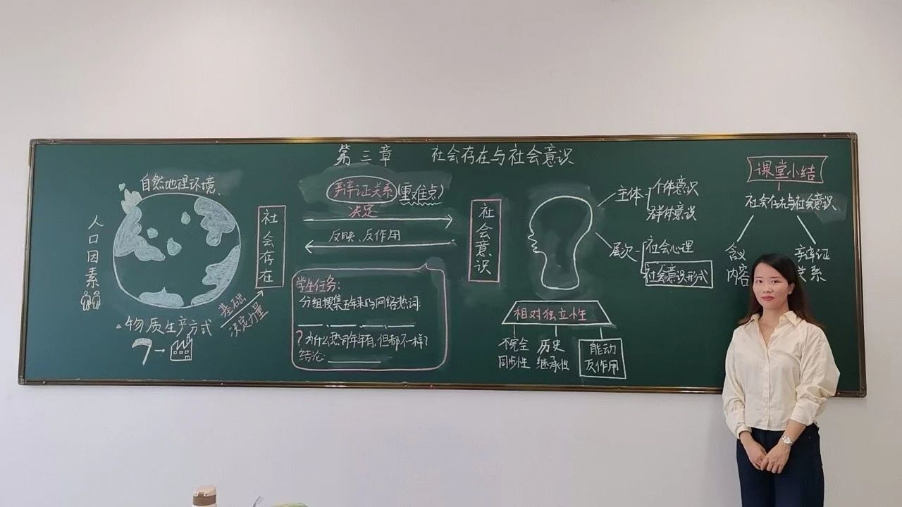 决赛开始哨声一吹响,参赛教师们迅速进入状态,他们专注思考,精心设计,用指尖的粉笔在黑板上绘制了教学内容重、难点的“可视化路径图”,动态生成了一份份简单直观的“知识图谱”。人文系李桐老师运用“金字塔”结构图为学生梳理学习的重点、难点、组织关系等内容,设计引入辩题引导学生辨析、举例、论证,用形象的简笔画帮助学生理解学习知识,启迪学生学会学习。