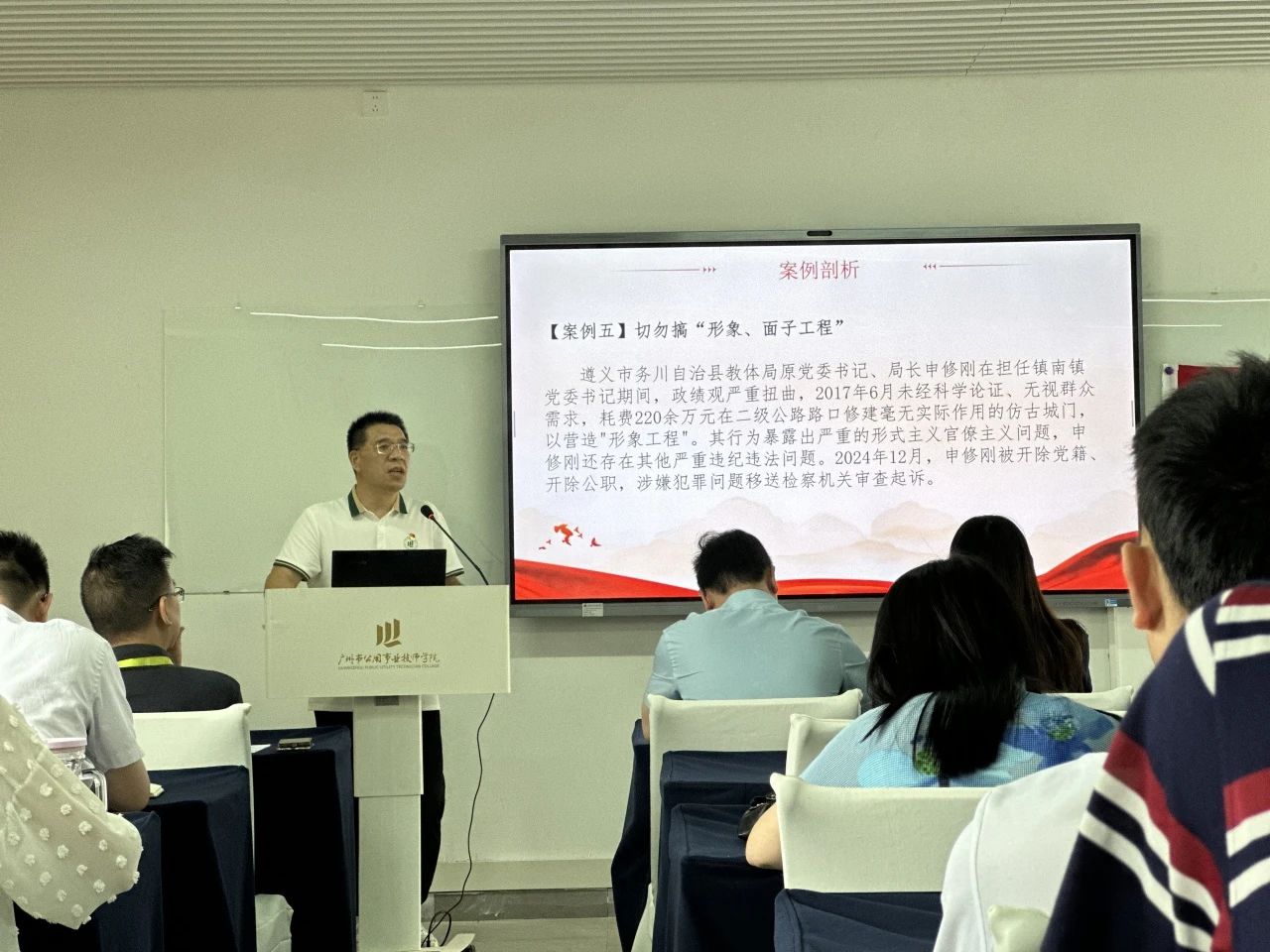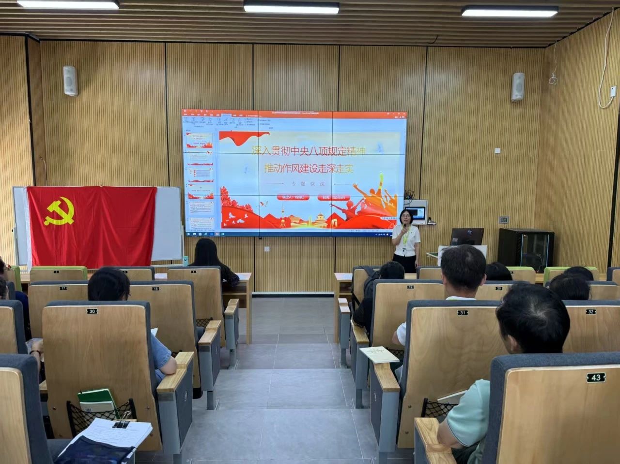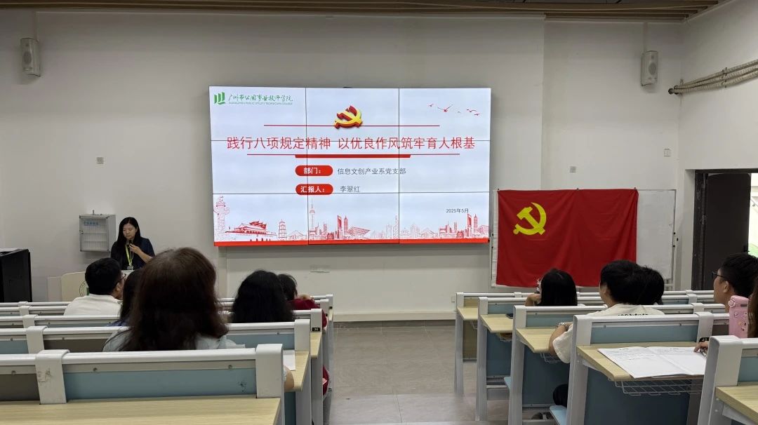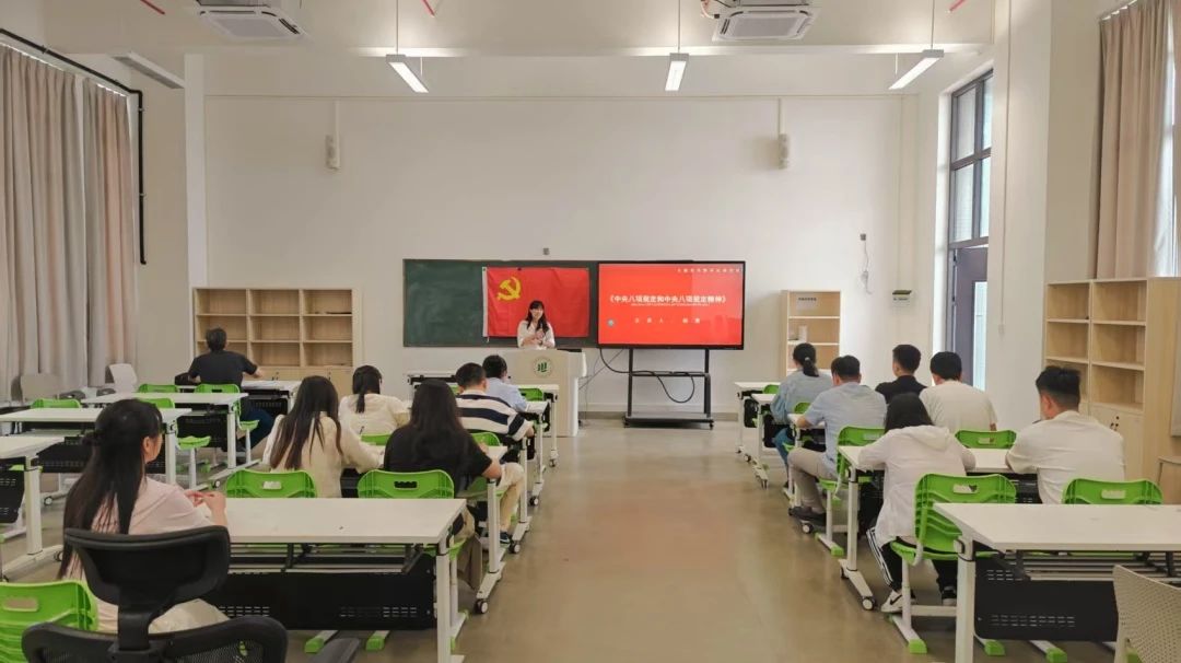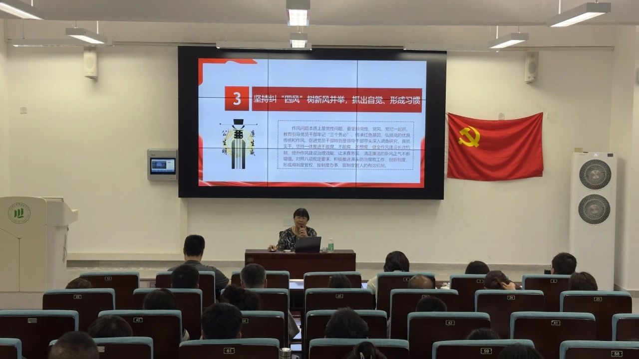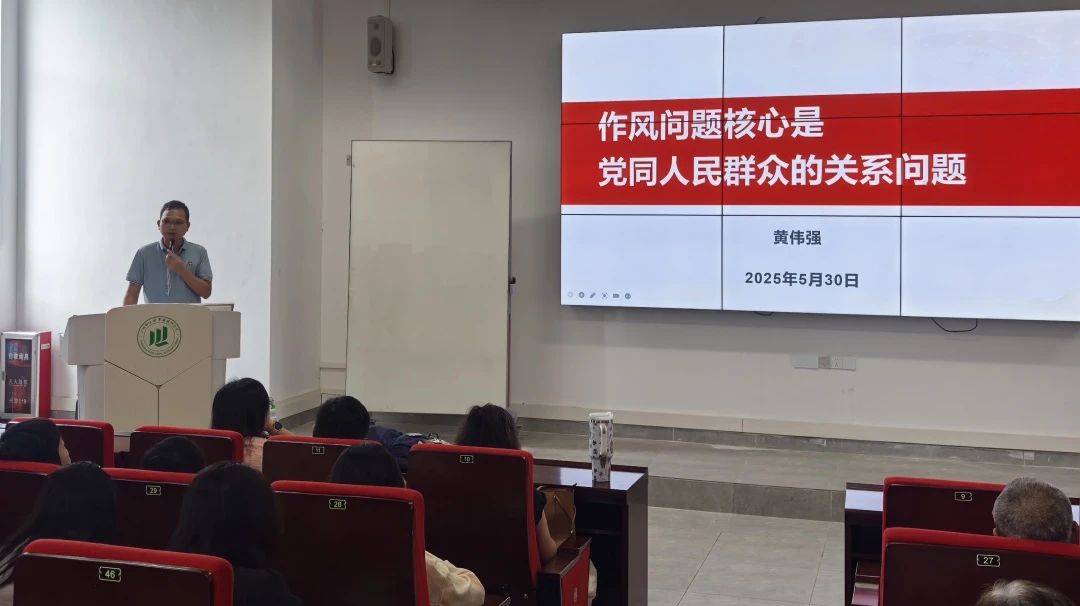 学院副院长黄丹凤讲授《深入贯彻中央八项规定精神学习教育 党的作风建设永远在路上》专题党课,黄丹凤副院长从学习教育出发点与落脚点、精神实质切入,结合常见违反表现及典型案例展开阐述。她强调,党员要以正确态度主动深学,强化自我反思与监督、坚守底线,将规定融入工作全环节,以务实廉洁作风促工作见实效 。
