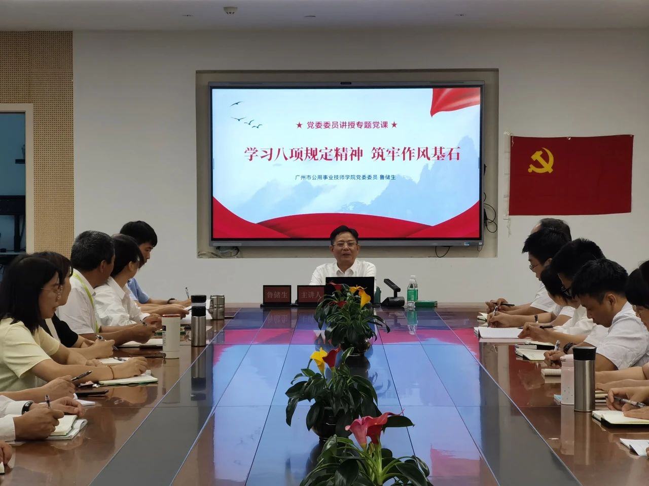 学院党委副书记、院长鲁储生讲授《学习八项规定精神,筑牢作风基石》专题党课,鲁储生院长从八项规定的缘起和历史发展、八项规定的精神实质与违纪行为界定、学院作风建设的重要性以及学院党员贯彻八项规定精神的必要性四个方面展开讲解。他强调,学院作风建设关系到学院的形象和发展,更关系到学生的成长和未来。全体党员作为学院发展的先锋力量,要认真学习八项规定精神,筑牢学院作风基石;在教学与管理中,力戒形式主义,不搞花架子,真抓实干提升教育质量;在生活上,坚决抵制享乐主义与奢靡之风,保持艰苦朴素作风;时刻严于律己,自觉接受监督,以公正廉洁的形象赢得师生信任;积极传播正能量,带动身边人共同遵守规定,营造风清气正的校园氛围。