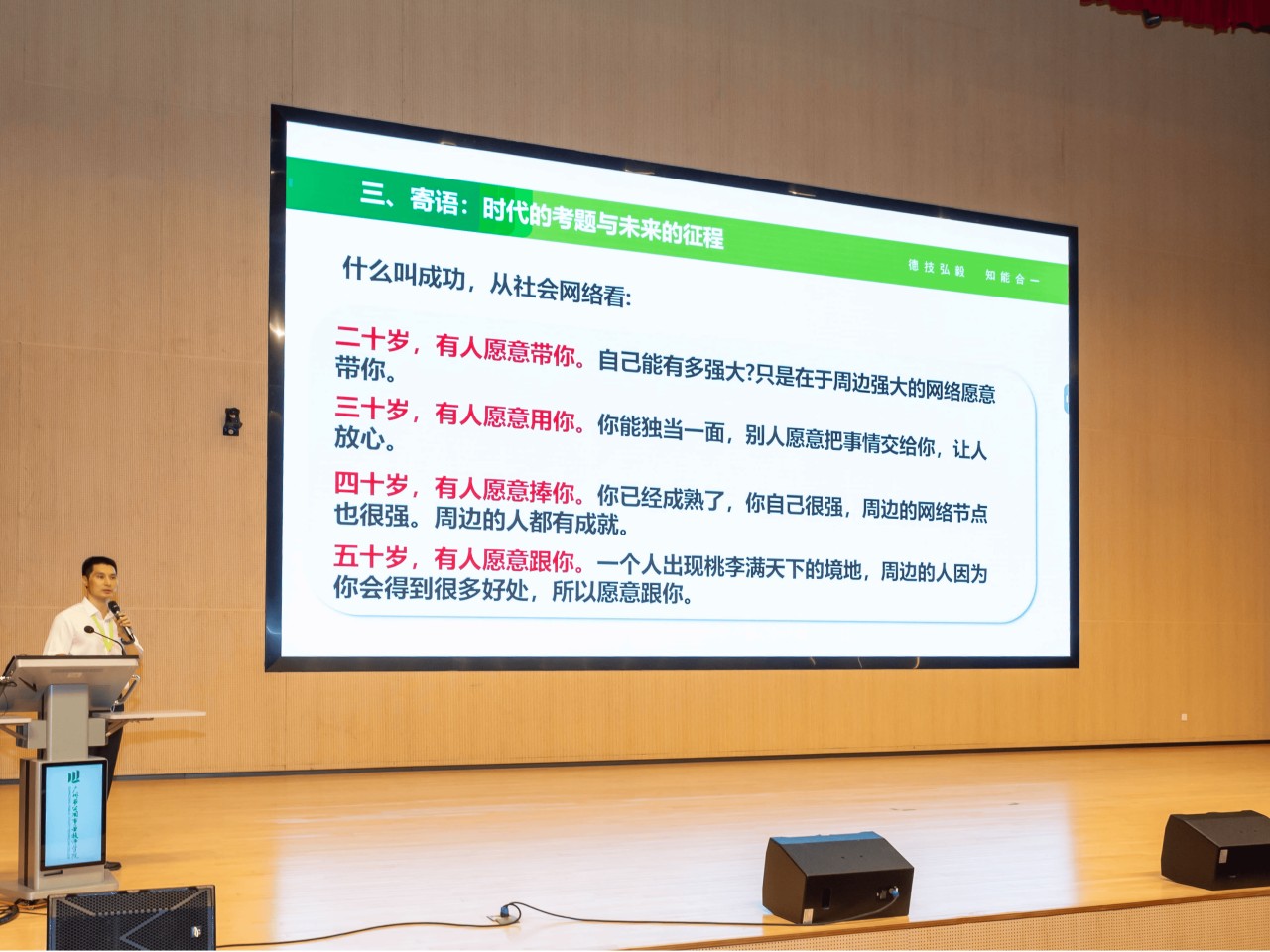 活动在暖心的开场视频中拉开帷幕,帧帧画面诉说着学生们青春的奋斗足迹。智能控制产业系主任罗贤以“时代的考题与未来的征程”为主题深情寄语26届学子,带领学子们回顾校园生活、感悟成长历程和展望未来发展。他引用史铁生哲思,传递化困境为机遇的智慧;融合寇准处世之道与马斯洛需求理论,阐释行动力、团队协作与终身成长的重要性,提出成功是社会网络赋能的结果;根据海因里希法则的数据与逻辑,强调要用敬畏之心筑牢安全底线;以陌上花开典故作结,勉励学子们保持从容心态。
