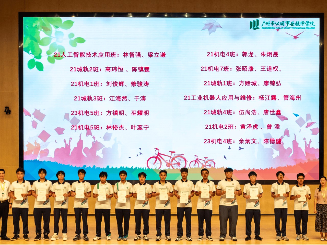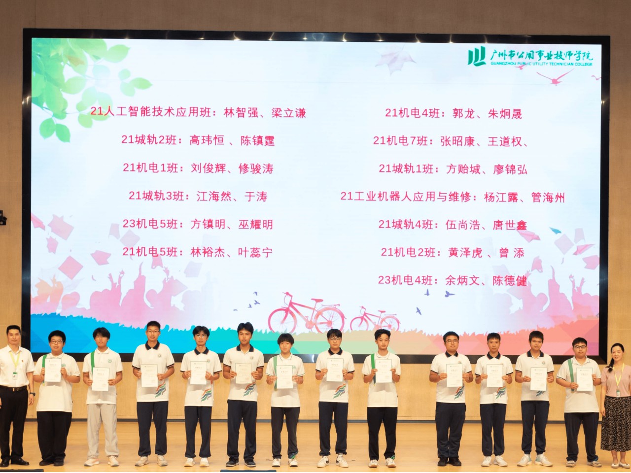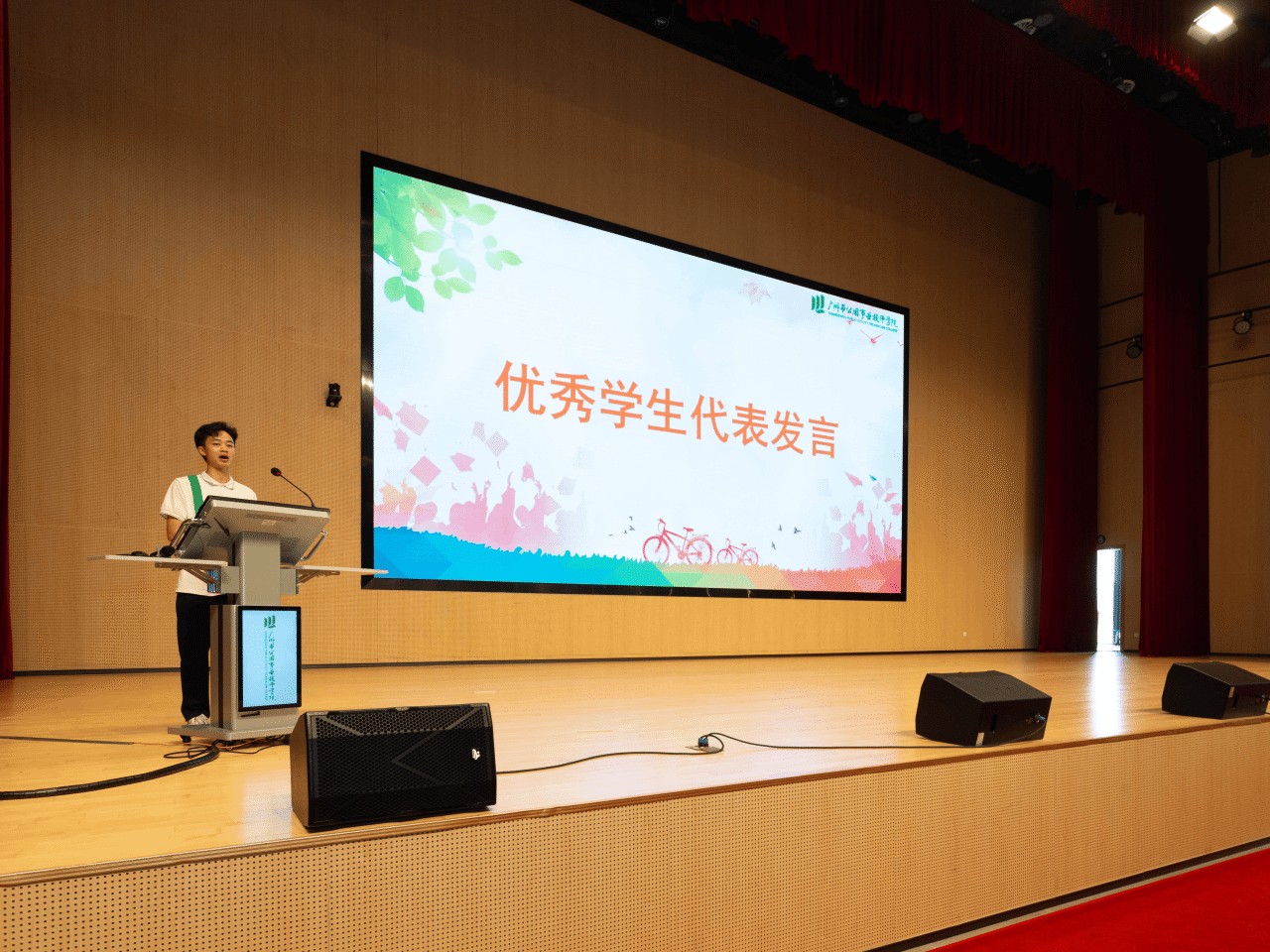 优秀学生代表、21级工业机器人班杨江露同学以真挚的话语分享了他的励志成长故事。从中考失利后的迷茫,以及在学业初期的挫折感,再到深刻体会“没有技能只能被动吃苦”,他坚定了技能成才的决心。正是学院的悉心培养和师长的谆谆教诲,他终能在智能制造领域开拓新天地。他以“每个时代的星火,都是由不甘熄灭的眼睛点燃的”激励同学们,表达了对未来实习与职业发展的憧憬与决心。