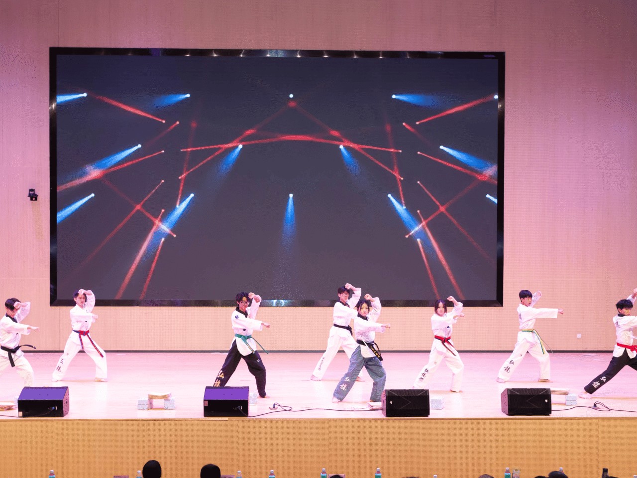 同学们还带来了精彩的文艺表演。跆拳道社团的跆舞表演《极宇流光》以刚劲有力的动作展现力量之美;校园歌手张昊同学倾情演唱《我们的明天》,现场手机灯光汇聚成星海,呼应着“以技能点亮人生”的主题。
