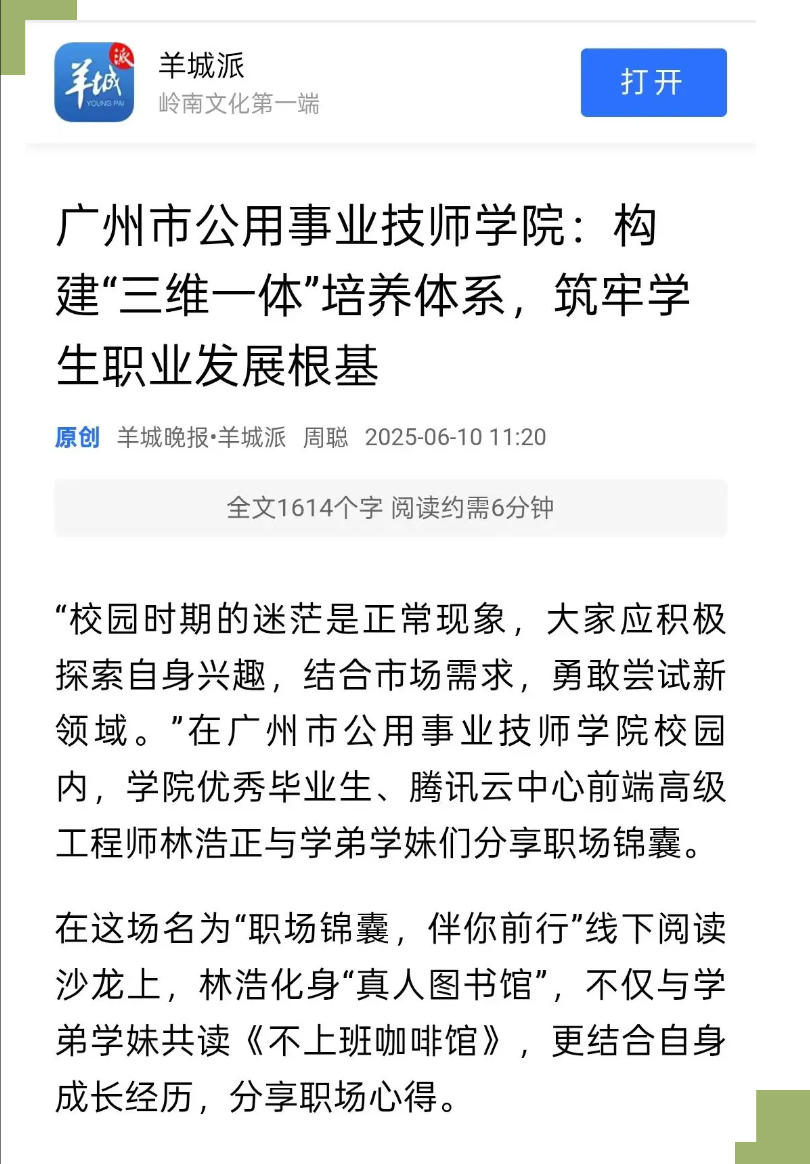 “校园时期的迷茫是正常现象,大家应积极探索自身兴趣,结合市场需求,勇敢尝试新领域。”在广州市公用事业技师学院校园内,学院优秀毕业生、腾讯云中心前端高级工程师林浩正与学弟学妹们分享职场锦囊。