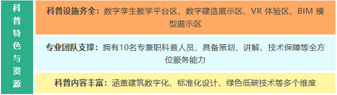 科普基地分别位于学院科教城校区内和华森公司,学院科普基地以数字化展厅及实训场地为载体,配备VR建筑体验设备、建筑模型实训工具等,核心围绕建筑数字化技术,通过“虚实结合、互动体验”的方式,将前沿的BIM技术、智能建造等专业内容转化为大众可感知的科普资源,推动建筑科技的社会化普及。