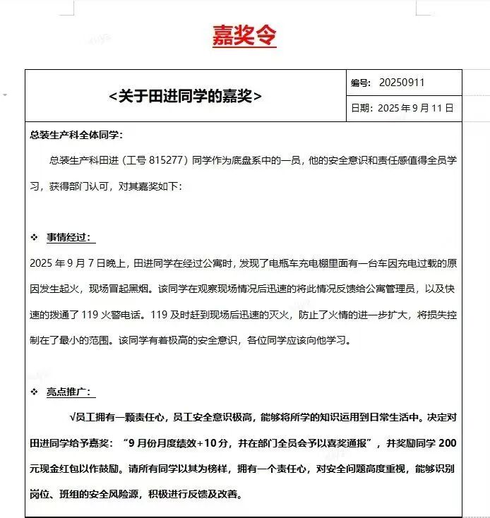 2025年9月7日晚,田进同学在公寓附近突然发现电瓶车充电棚冒出黑烟,发现是充电过载引发火情。面对突发情况,他没有慌乱,而是第一时间报告管理员并拨打119,为消防人员及时控制火情争取了宝贵时间。
