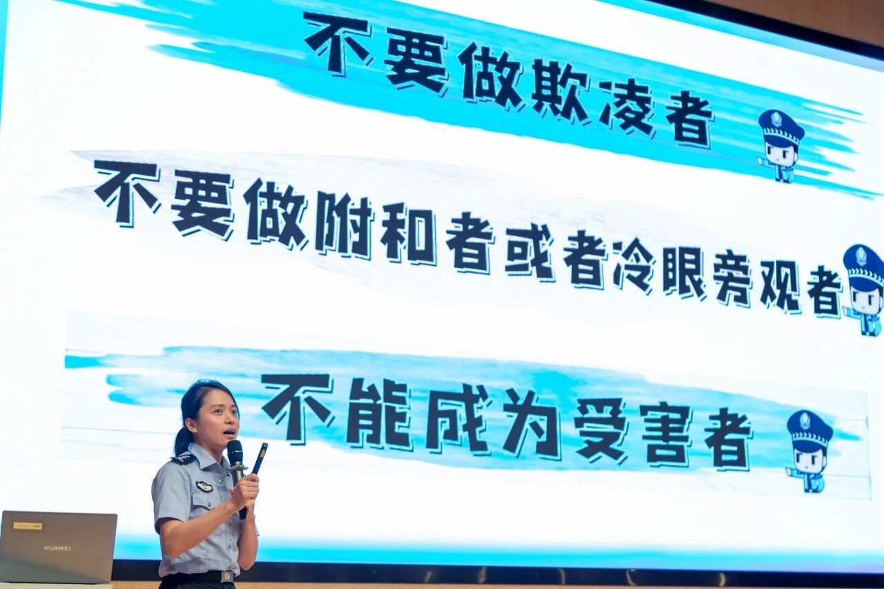 在讲座中,廖所长详细介绍了校园欺凌的多种形式,包括肢体欺凌、言语欺凌、社交欺凌、网络欺凌以及财产欺凌。他提醒同学们,要时刻保持警惕,学会识别和防范校园欺凌行为,遇到欺凌时要勇敢地说“不”,并及时向老师、家长或相关部门求助。