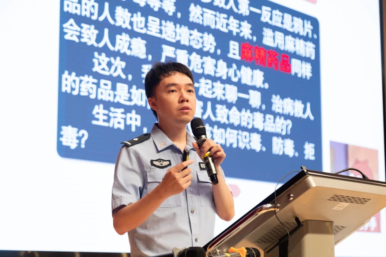 宣讲员黎杰文警官介绍了毒品的危害、种类及识别方法,并结合实际案例,重点解析新列管的精神药品“依托咪酯”和“右美沙芬”的成瘾机制,揭穿新型毒品的“美丽陷阱”,构筑起识毒防毒的“青春防火墙”。