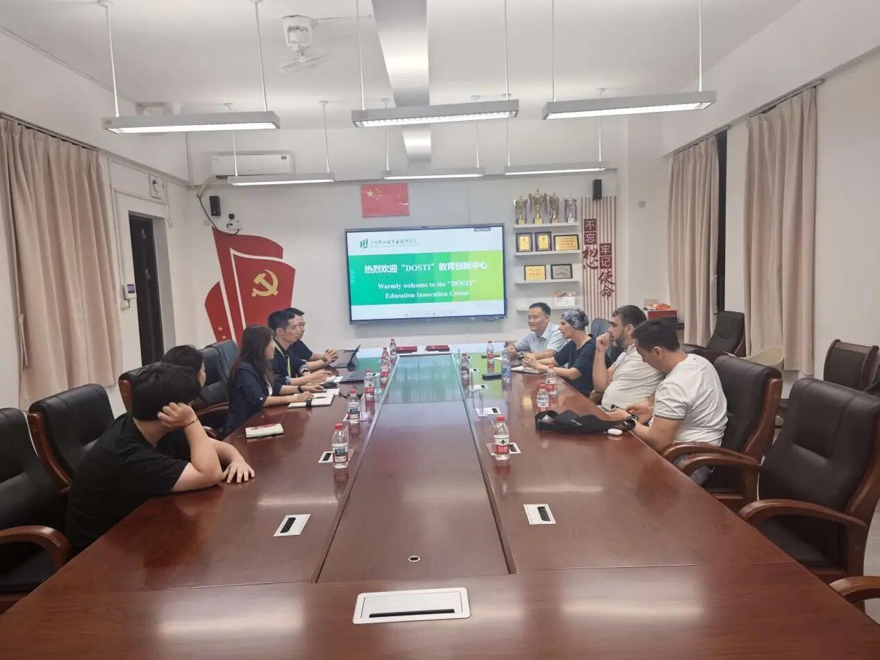 在随后的座谈会上,学院副院长刘毅详细介绍了学院发展情况、智能控制产业系及电子技术赛项情况,哈萨克斯坦DOSTI创新中心负责人迪米特里·卡拉耶夫阐述了哈萨克斯坦DOSTI创新中心的发展历程、技术优势、创新成果等情况。DOSTI创新中心是哈萨克斯坦世赛组委会的重要合作伙伴,在电子技术等领域拥有丰富的人才培养经验。双方代表就电子技术项目的训练设施设备、相关领域国际人才培训项目等展开了深入交流。最后,刘毅副院长与DOSTI创新中心负责人迪米特里·卡拉耶夫进行签约,参会人员共同见证这一重要时刻。