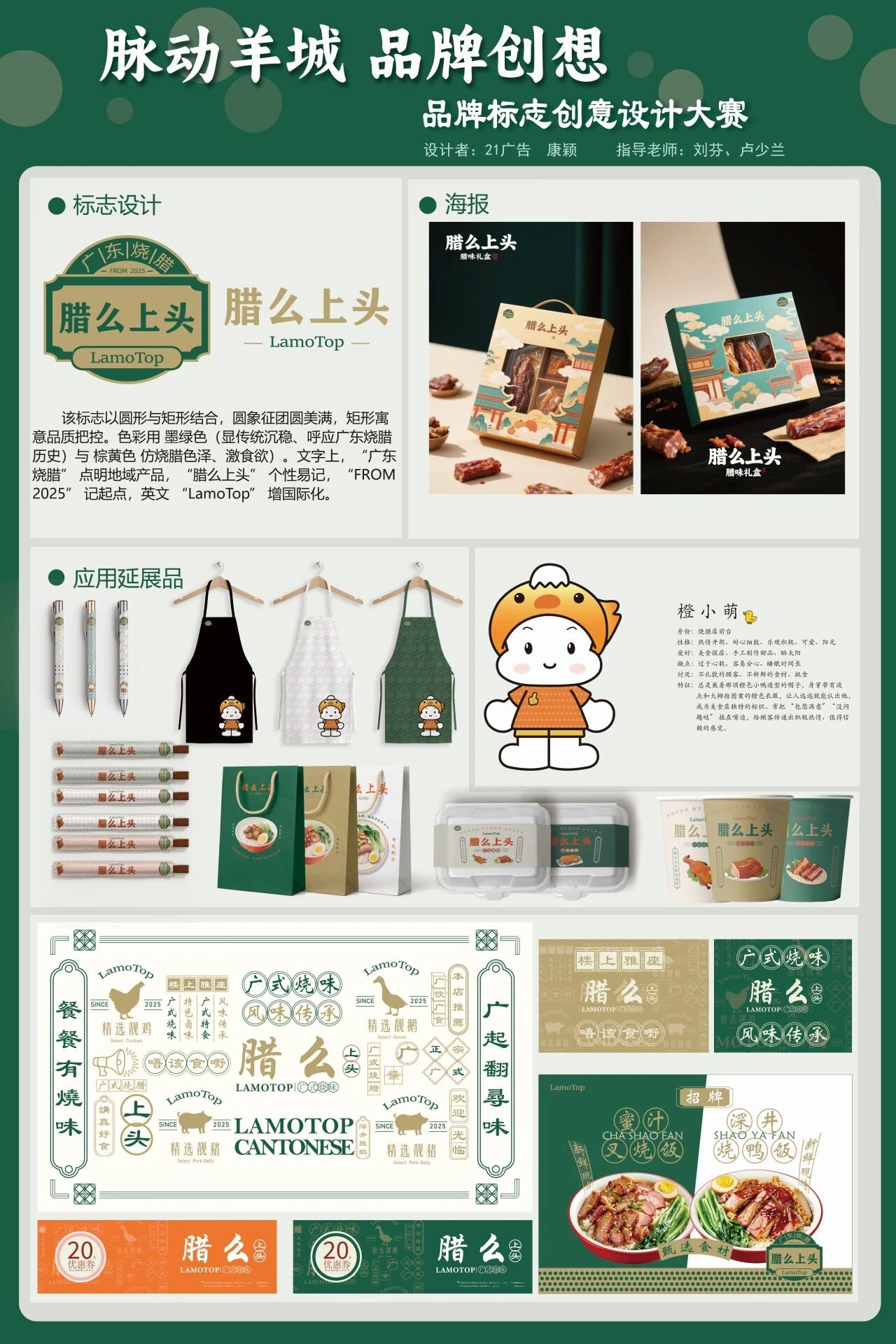 “不做单纯的传统复刻,也不盲目追求新潮,而是要让‘老味道’通过现代设计语言,真正走进当代生活.....从标志到标准色,从海报到延展应用,每一处都反复打磨,力求作品既有文化底蕴,又契合现代传播需求。”来自21广告1班的获奖学生代表康颖分享了她的选题思考和创作过程,最终以广式腊味为灵感,结合年轻化视觉语言,打造出兼具传统韵味与现代潮感的品牌形象,传递“岭南风味,上头难忘”的消费体验。