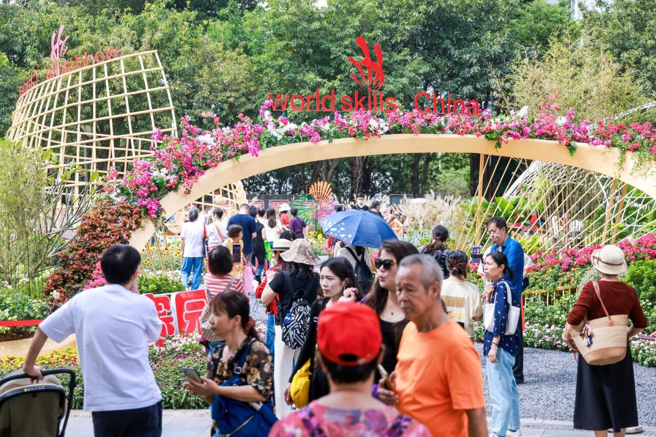 世赛园不仅是视觉的盛宴,更是可触可感的技能实践场。园内多处精心布置了世界技能大赛金牌选手的匠心之作,从竹艺构件到微景观小品,皆可见证顶尖技艺的印记。开幕式当日,世赛园现场还设有组合盆栽制作体验、互承结构木桥、六角亭搭建等7个世界技能大赛互动体验项目,让市民亲身体验“无钉无胶”的传统木构搭建等精湛技艺,感受榫卯与力学的精妙融合。