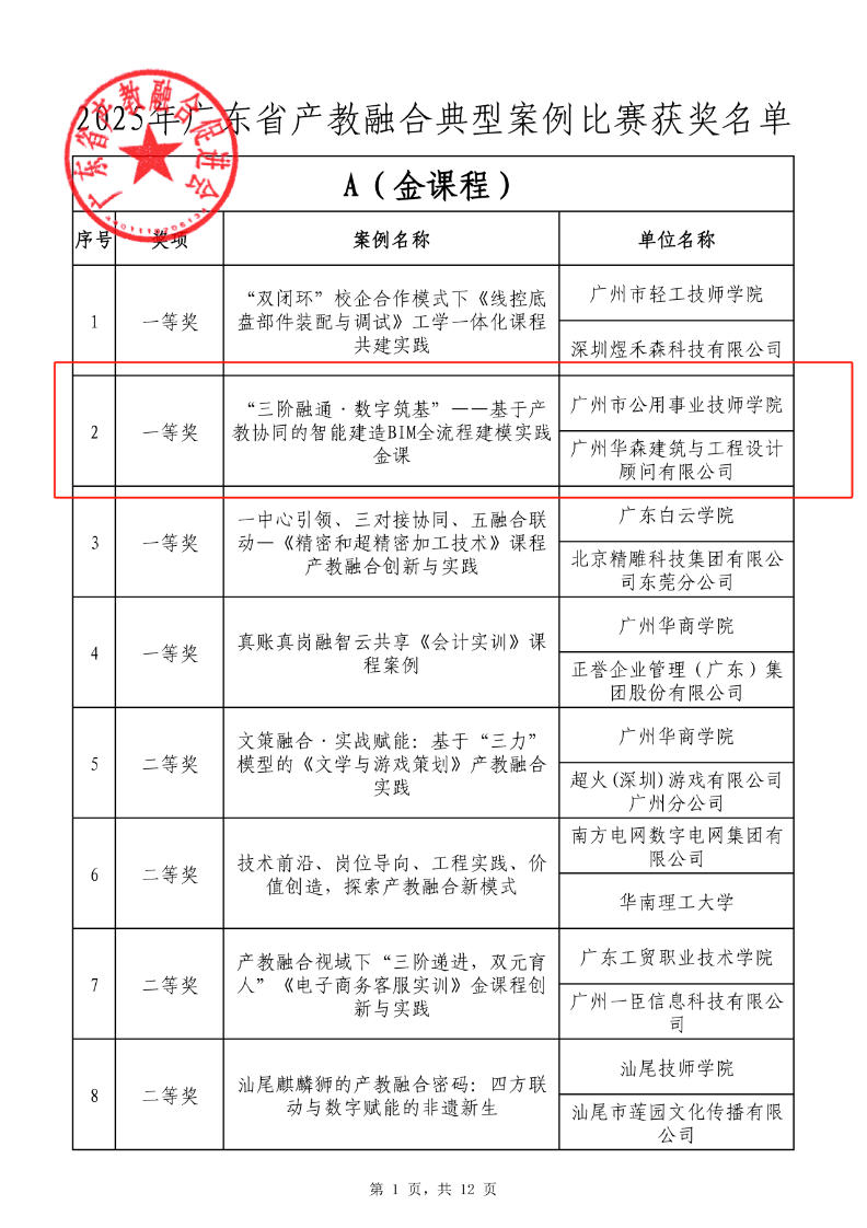 近日,由广东省发展和改革委员会指导、广东省产教融合促进会主办的2025年广东省产教融合典型案例比赛圆满落幕。由学院与广州华森建筑与工程设计顾问有限公司联合申报的《“三阶融通·数字筑基”——基于产教协同的智能建造BIM全流程建模实践金课》,历经多轮评审与现场答辩,最终脱颖而出,荣获“金课程”类金奖。