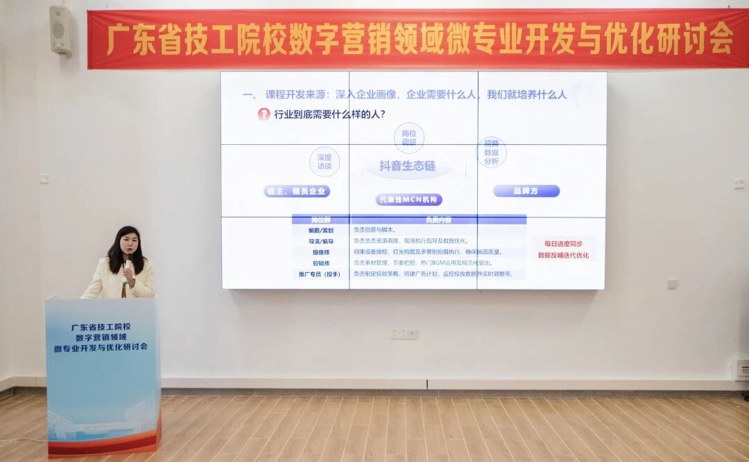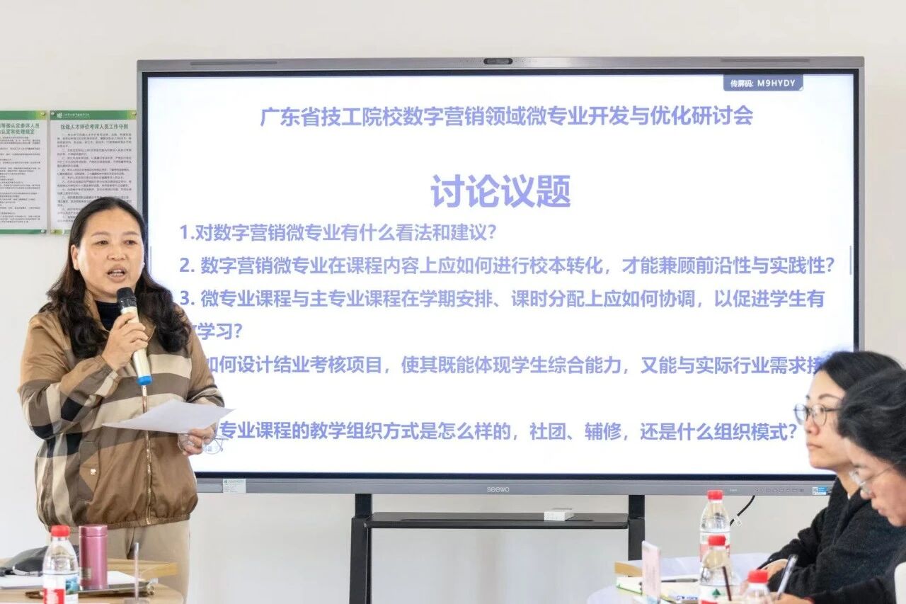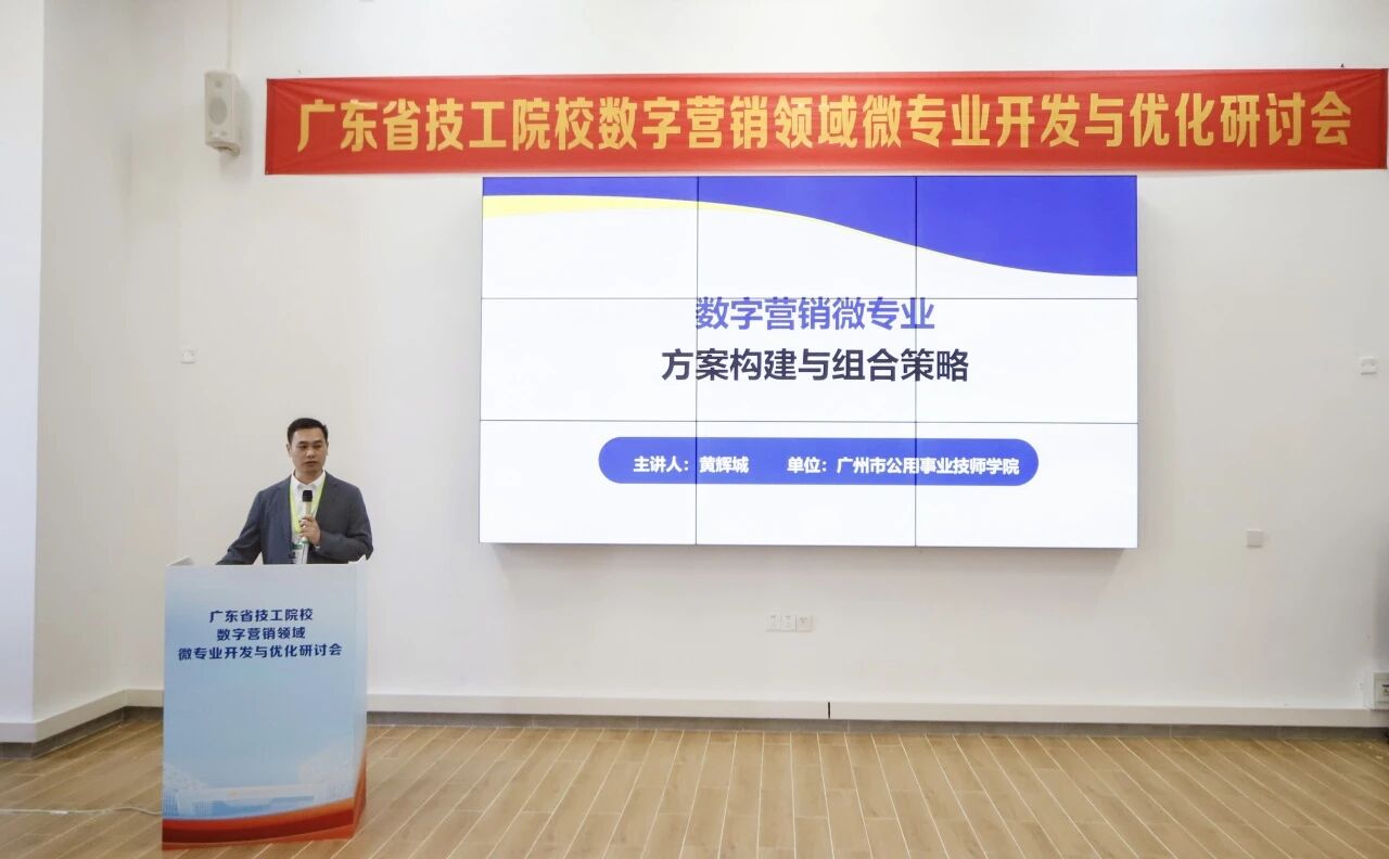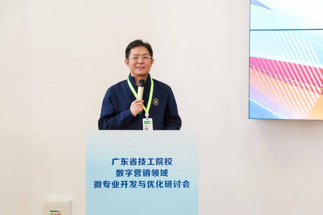随后,广东省职业技术教研室相关科室围绕“产教评技能生态链背景下的技工院校微专业开发”作专题分享,从政策要求、建设路径、实践要点等方面,为全省微专业建设明晰方向;广州市技师学院副院长陈实聚焦“数字营销领域微专业开发”,分享了标杆院校的专业建设思路与育人模式;学院社会服务产业系主任黄辉城以《数字营销微专业方案构建与组合策略》为题,从微专业定位、融合路径、应用示例及优化机制等方面,展示了学院在数字营销微专业建设中的探索与思考;学院副院长王尚军则从微专业与主专业的边界、微专业的开发逻辑、教学组织形式和考核等方面进行分享;广东省电子商务技师学院副院长黄文苑以《短视频创作与推广》为例,拆解“从岗位任务到微课程模块”的开发逻辑,干货满满。