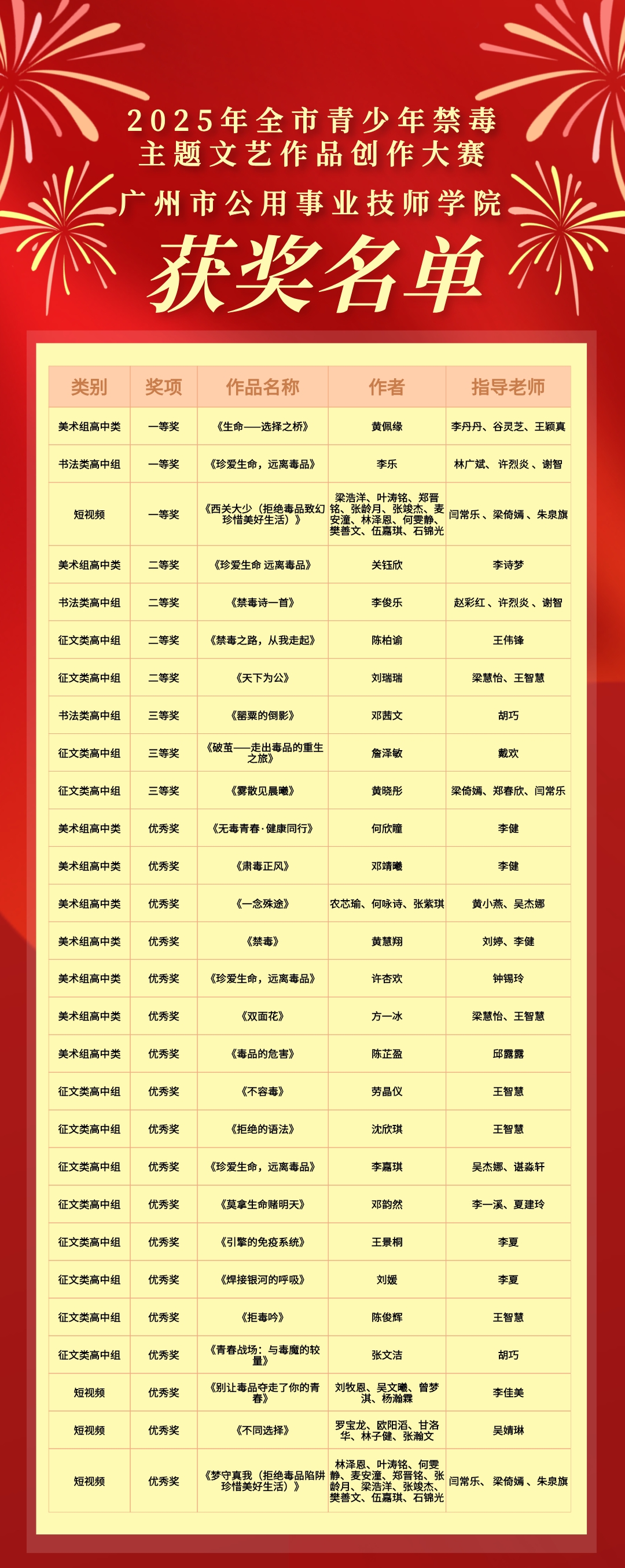 为进一步扩大禁毒宣传影响力,传播禁毒正能量,引领禁毒新风尚,巩固广州市创建全国禁毒示范城市成果,在由广州市禁毒委员会办公室、广州市教育局、广州市人力资源和社会保障局及共青团广州市委员会联合举办的2025年全市青少年禁毒主题文艺作品创作大赛中,学院喜获佳绩,共获28个奖项,包括一等奖3项、二等奖4项、三等奖3项及优秀奖18项。
