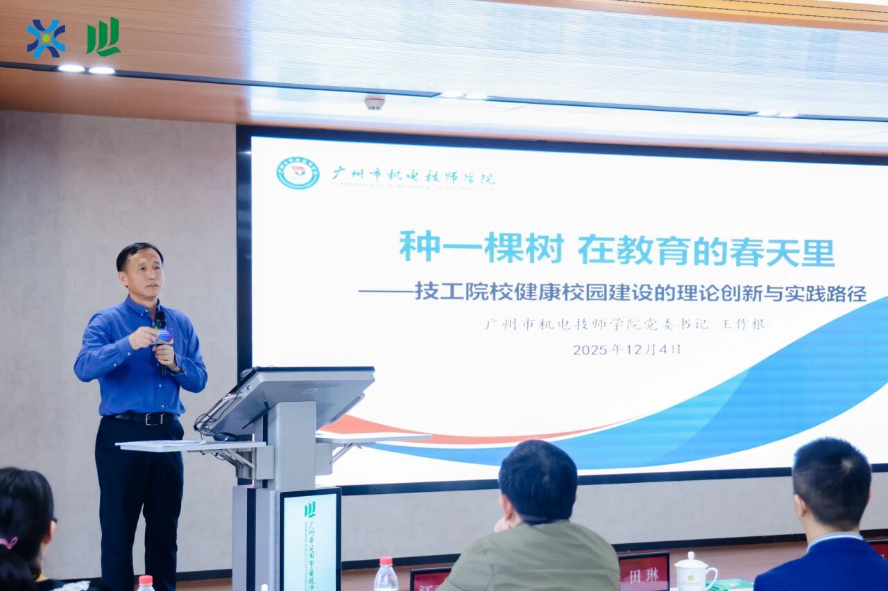 广州市机电技师学院党委书记王作根围绕“种一棵树,在教育的春天里”这一主题,用“树木”喻“树人”,系统阐述健康校园建设的“根脉—树干—枝叶”框架,强调党的领导、思政引领与实践体系的协同构建。他强调,一是要深植“根脉”,把稳方向,坚持党的领导是健康校园建设的根本保证;二是要强壮“树干”,铸魂育人,坚持思政引领是健康校园建设的理论支柱;三是要繁茂“枝叶”,固本培元,构建技工院校健康校园建设的实践体系。