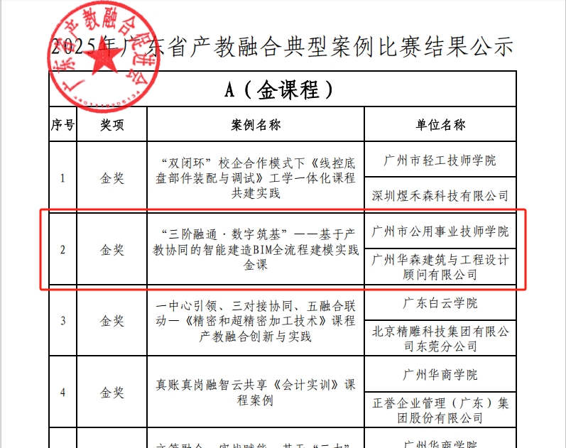 近日,由广东省发展和改革委员会指导、广东省产教融合促进会主办的2025年广东省产教融合典型案例比赛圆满落幕。由学院与广州华森建筑与工程设计顾问有限公司联合申报的《“三阶融通·数字筑基”——基于产教协同的智能建造BIM全流程建模实践金课》,历经多轮评审与现场答辩,最终脱颖而出,荣获“金课程”类金奖。